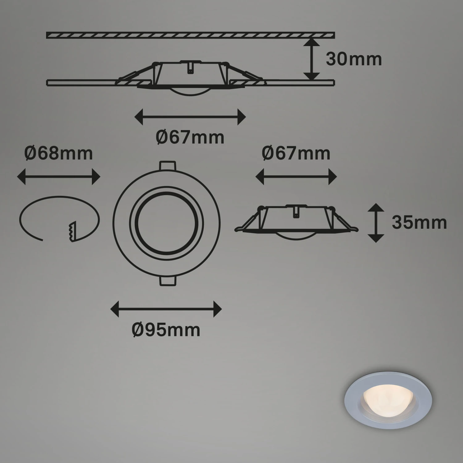Ein besonderes Highlight dieser LED Einbaustrahler ist das 3W-LED-Modul in Kugelform, das dank einer milchigen Kunststoffabdeckung das Licht blendfrei im Wohnraum verteilt. Die LED Einbaulampen im 3er Set fügen sich durch ihr ultraflaches Design gut in Ihre Räumlichkeiten wie Wohnzimmer, Schlafzimmer oder Flur ein und sind durch die Schutzart IP44 auch spritzwassergeschützt, so dass sie auch als Badezimmerleuchten eingesetzt werden können. Die LED-Module der LED Deckenspots haben eine Leistung von 3 Watt, eine Helligkeit von 260 Lumen und eine warmweiße Farbtemperatur von 3.000 Kelvin. Die LED-Deckenstrahler haben eine lange durchschnittliche Lebensdauer von ca. 25.000 Stunden. Produktmaße 95x36mm (DxH); Einbaumaße 68x30mm (DxH)