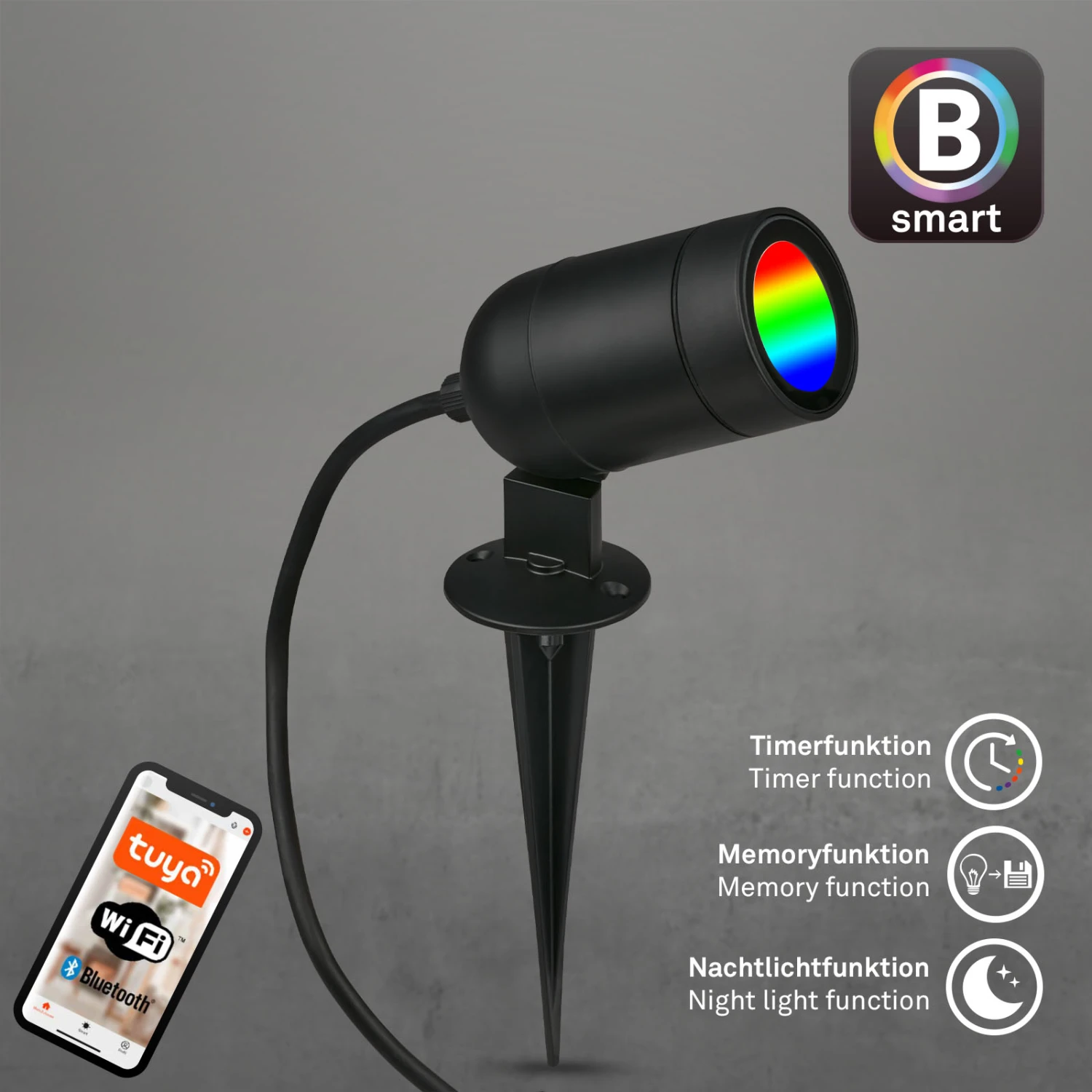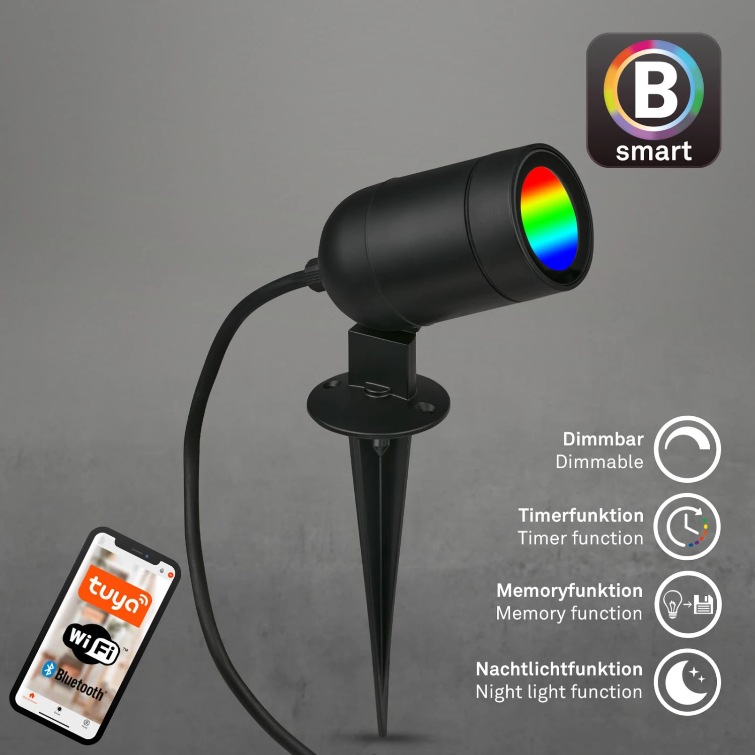 Die Tuya App macht es einfach, diese LED-Gartenleuchte mit Erdspieß zu verwalten. Ündern Sie je nach Vorliebe die Lichtfarben (RGB) und Farbtemperaturen von Warmweiß bis Kaltweiß. Per Sprachsteuerung ist der LED-Gartenspieß über Ihren Sprachassistenten bequem zu steuern. Die smarte Außenlampe ist ideal zur Beleuchtung von Wegen, Pflanzen, Teich, Terrassen und Veranda und mehr. Die Lampe kann zudem auch als Wandleuchte an der Hauswand montiert werden. Der Spotkopf der Außenlampe ist beweglich und kann geschwenkt werden, um Ihr Blumenbeet, Bäume, Pflanzen und den Gartenweg zu beleuchten. Die smarte Gartenlampe hat eine Größe von 120x60x265 mm, kann leicht im Boden installiert werden und wird mit einem Stecker betrieben.