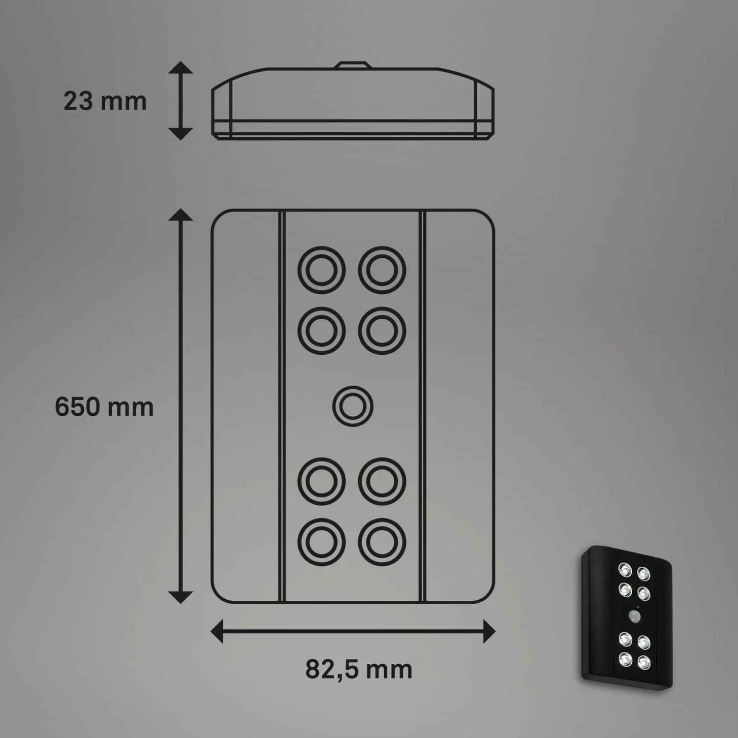 – und Werkstattleuchte ist diese kleine Batterieleuchte am besten in Fluren, Schränken, Kinderzimmern, Durchgängen und unter Hängeschränken zu gebrauchen. Der Bewegungssensor hat einen Erfassungsbereich von 3 Metern und einen Erfassungswinkel von 80-100 Grad. Wenn das Nachtlicht eine Bewegung erkennt, schaltet es sich für 30 Sekunden ein. Für die Installation sind keine Bohrungen erforderlich. Die LED-Schrankleuchte lässt sich mit dem mitgelieferten Klebestreifen sicher und schnell befestigen. 8 AAA-Batterien versorgen die Schrankunterbauleuchte mit Strom. Diese sind ebenfalls im Lieferumfang enthalten. Ein Lichtsensor ermöglicht das Einschalten bei Bewegungserkennung in Dunkelheit. Auch ein Dauerlicht über den Tag hinweg ist einstellbar. Das Licht ist mit 6500 Kelvin eine kaltweiße Farbtemperatur. Mit 116×82,5×23 mm (LxBxH) ist das Treppenlicht ein unauffälliger Helfer im Alltag. Die Produktfarbe ist Schwarz
