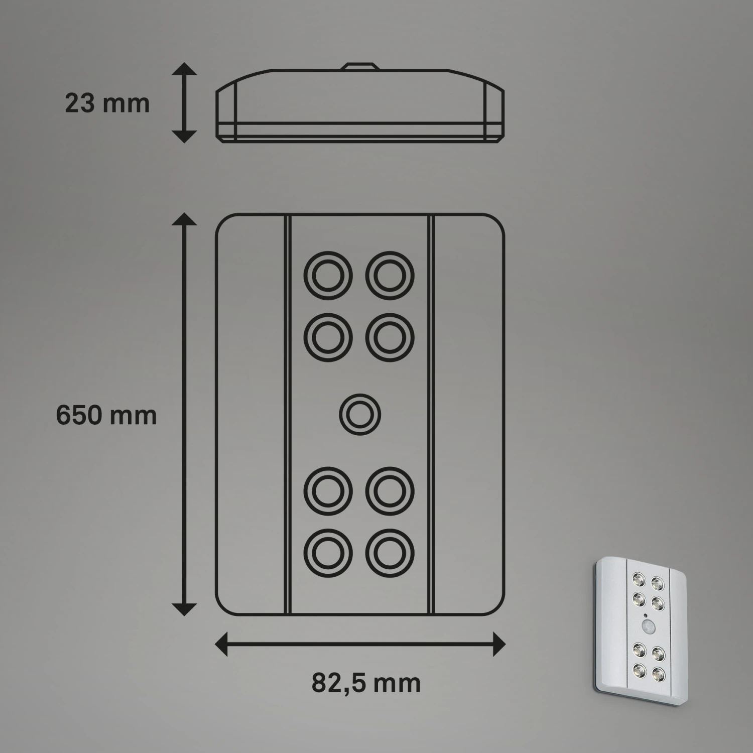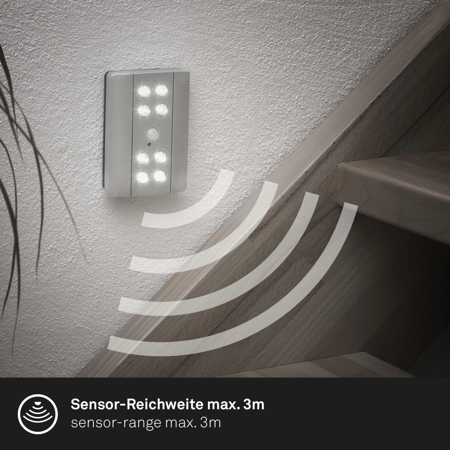 – und Werkstattleuchte ist diese kleine Batterieleuchte am besten in Fluren, Schränken, Kinderzimmern, Durchgängen und unter Hängeschränken zu gebrauchen. Der Bewegungssensor hat einen Erfassungsbereich von 3 Metern und einen Erfassungswinkel von 80-100 Grad. Wenn das Nachtlicht eine Bewegung erkennt, schaltet es sich für 30 Sekunden ein. Für die Installation sind keine Bohrungen erforderlich. Die LED-Schrankleuchte lässt sich mit dem mitgelieferten Klebestreifen sicher und schnell befestigen. 8 AAA-Batterien versorgen die Schrankunterbauleuchte mit Strom. Diese sind ebenfalls im Lieferumfang enthalten. Ein Lichtsensor ermöglicht das Einschalten bei Bewegungserkennung in Dunkelheit. Auch ein Dauerlicht über den Tag hinweg ist einstellbar. Das Licht ist mit 6000 Kelvin eine kaltweiße Farbtemperatur. Mit 116×82,5×23 mm (LxBxH) ist das Treppenlicht ein unauffälliger Helfer im Alltag. Die Produktfarbe ist Titanfarbig.