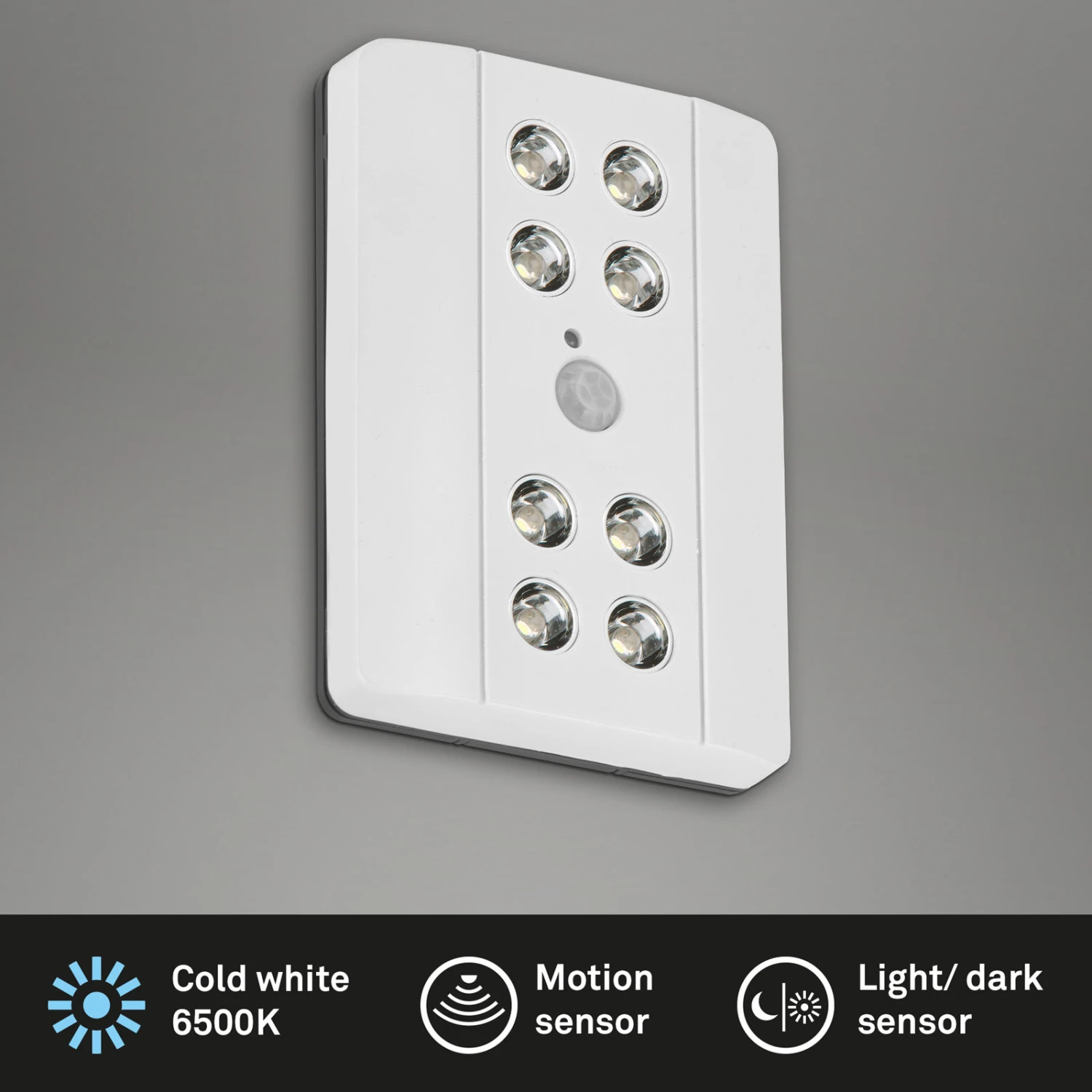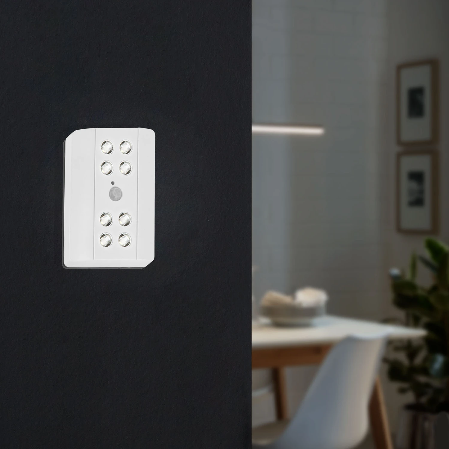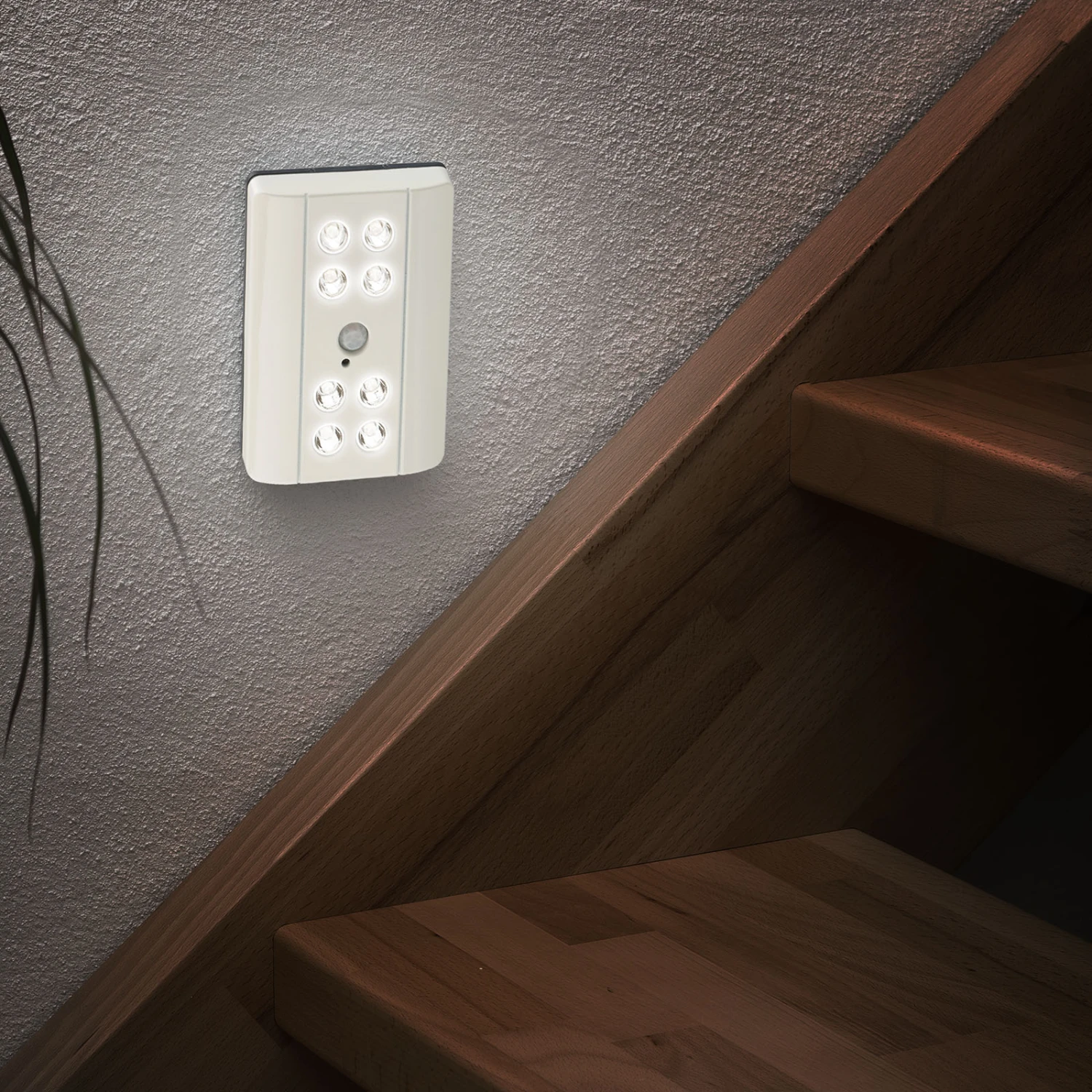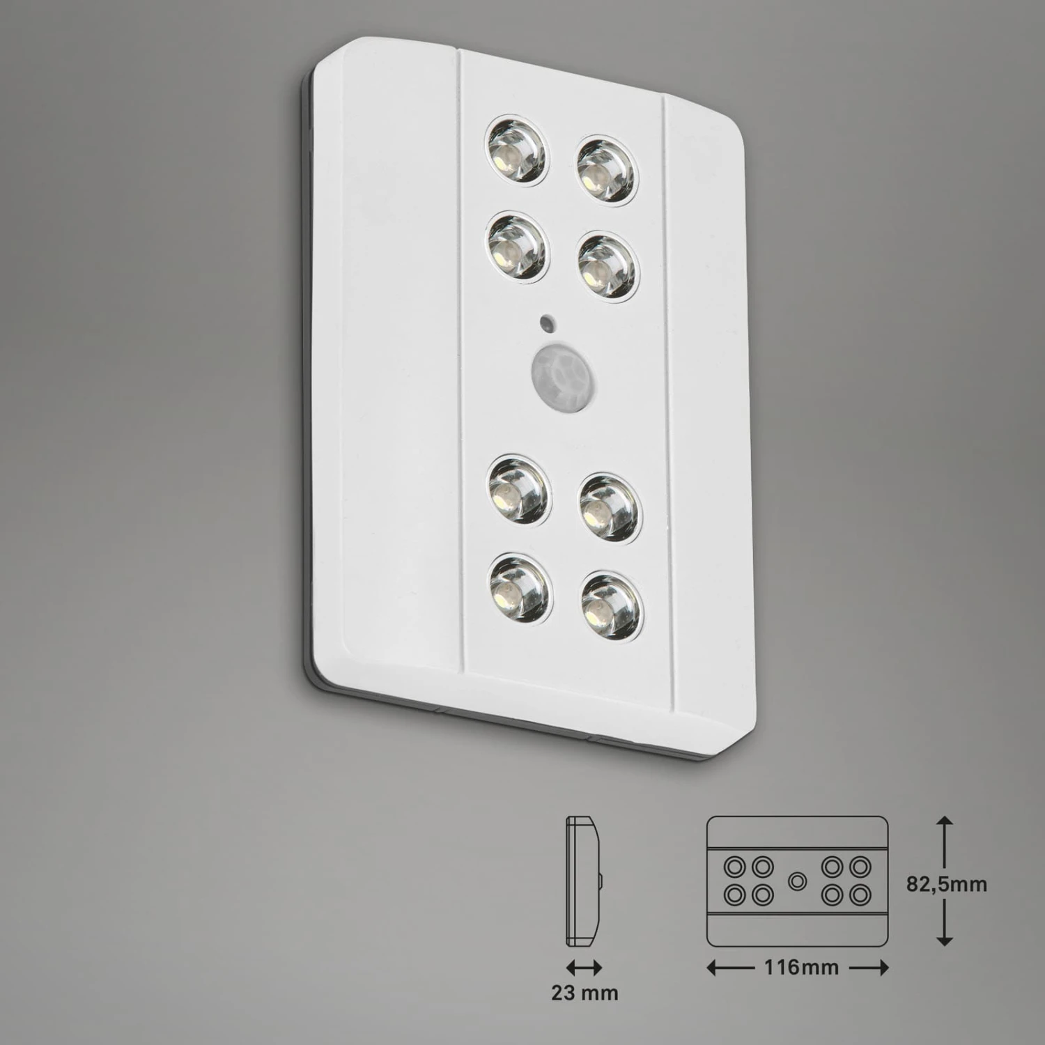 – und Werkstattleuchte ist diese kleine Batterieleuchte am besten in Fluren, Schränken, Kinderzimmern, Durchgängen und unter Hängeschränken zu gebrauchen. Der Bewegungssensor hat einen Erfassungsbereich von 3 Metern und einen Erfassungswinkel von 80-100 Grad. Wenn das Nachtlicht eine Bewegung erkennt, schaltet es sich für 30 Sekunden ein. Für die Installation sind keine Bohrungen erforderlich. Die LED-Schrankleuchte lässt sich mit dem mitgelieferten Klebestreifen sicher und schnell befestigen. 8 AAA-Batterien versorgen die Schrankunterbauleuchte mit Strom. Diese sind ebenfalls im Lieferumfang enthalten. Ein Lichtsensor ermöglicht das Einschalten bei Bewegungserkennung in Dunkelheit. Auch ein Dauerlicht über den Tag hinweg ist einstellbar. Das Licht ist mit 6500 Kelvin eine kaltweiße Farbtemperatur. Mit 116×82,5×23 mm (LxBxH) ist das Treppenlicht ein unauffälliger Helfer im Alltag. Die Produktfarbe ist Weiß