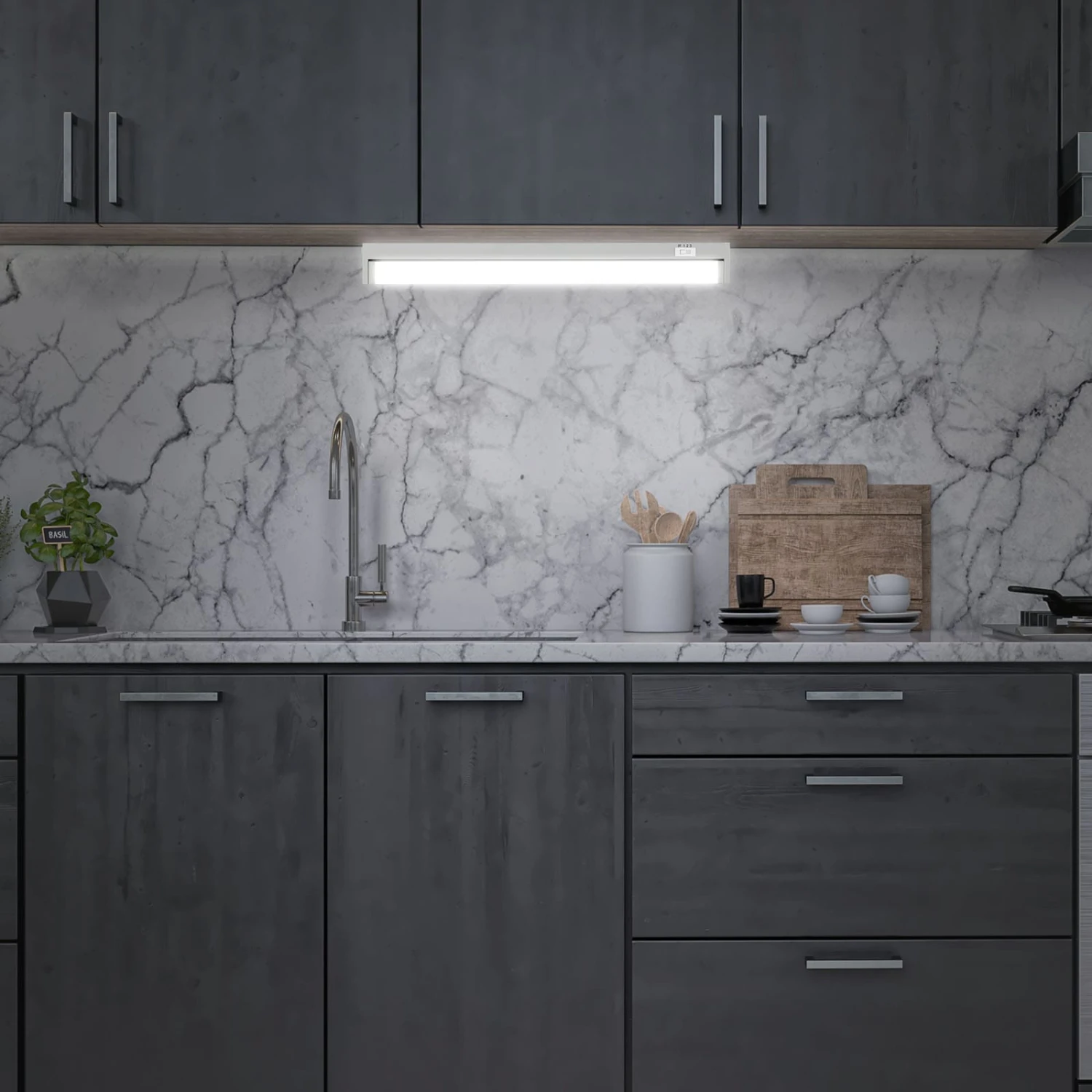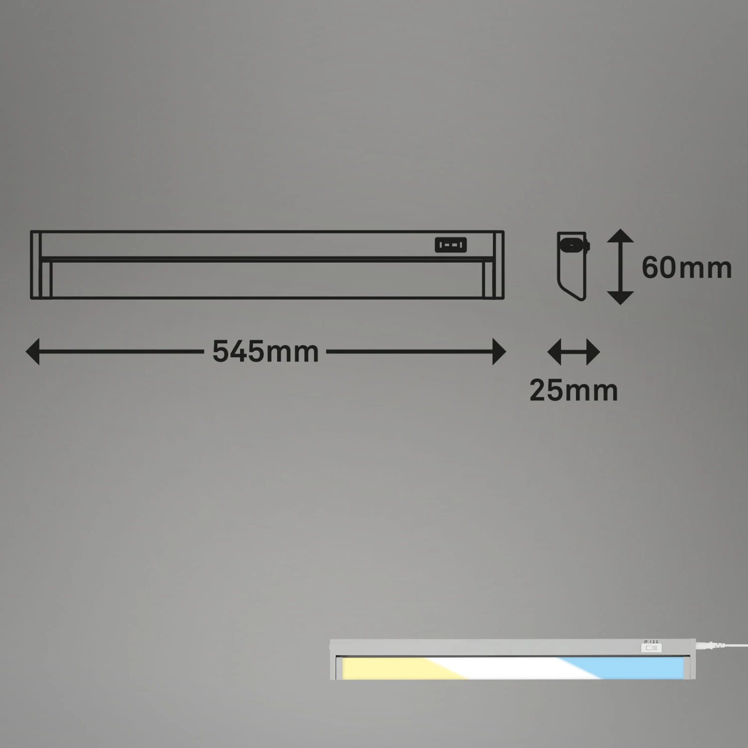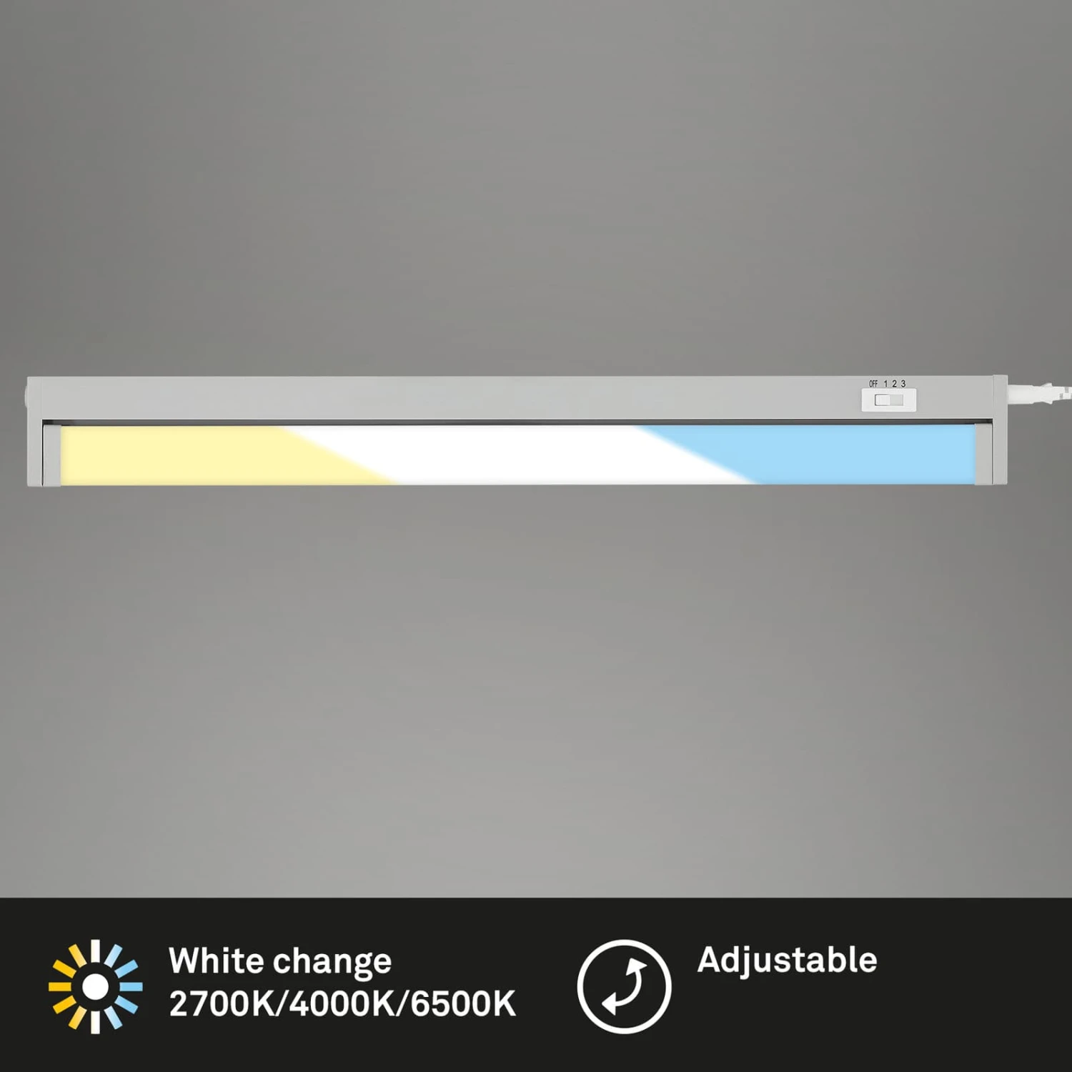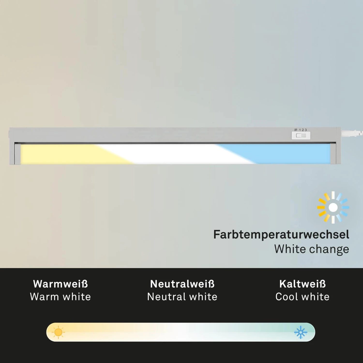 Die Farbtemperatur dieser silberfarbigen LED-Unterbauleuchte kann in Stufen eingestellt werden. Wählen Sie per Knopfdruck zwischen Warmweiß, Neutralweiß und Kaltweiß (2700K, 4000K, 6500K). Bis zu 10 weitere LED-Unterbaulampen können über einen einfachen Steckmechanismus angeschlossen werden. Die Unterschrankleuchte wird mit dem notwendigen Anschlusskabel geliefert. Die Schwenkfunktion der Lichtleiste ermöglicht es Ihnen, die Beleuchtung in Ihrer Küche oder Werkstatt nach Belieben zu verändern. Diese LED-Küchenleiste ist mit 6 Watt und 720-800 Lumen Helligkeit je nach Lichtfarbe ausgestattet. Die LED-Leiste ist 545x60x25 mm groß (LxBxH).