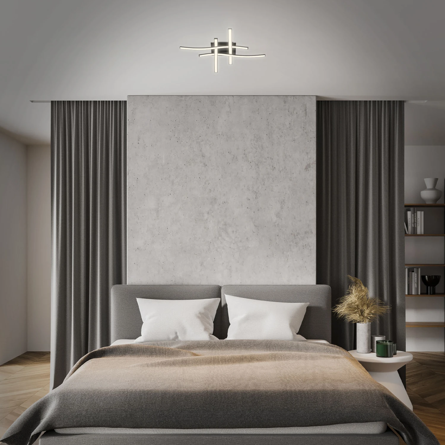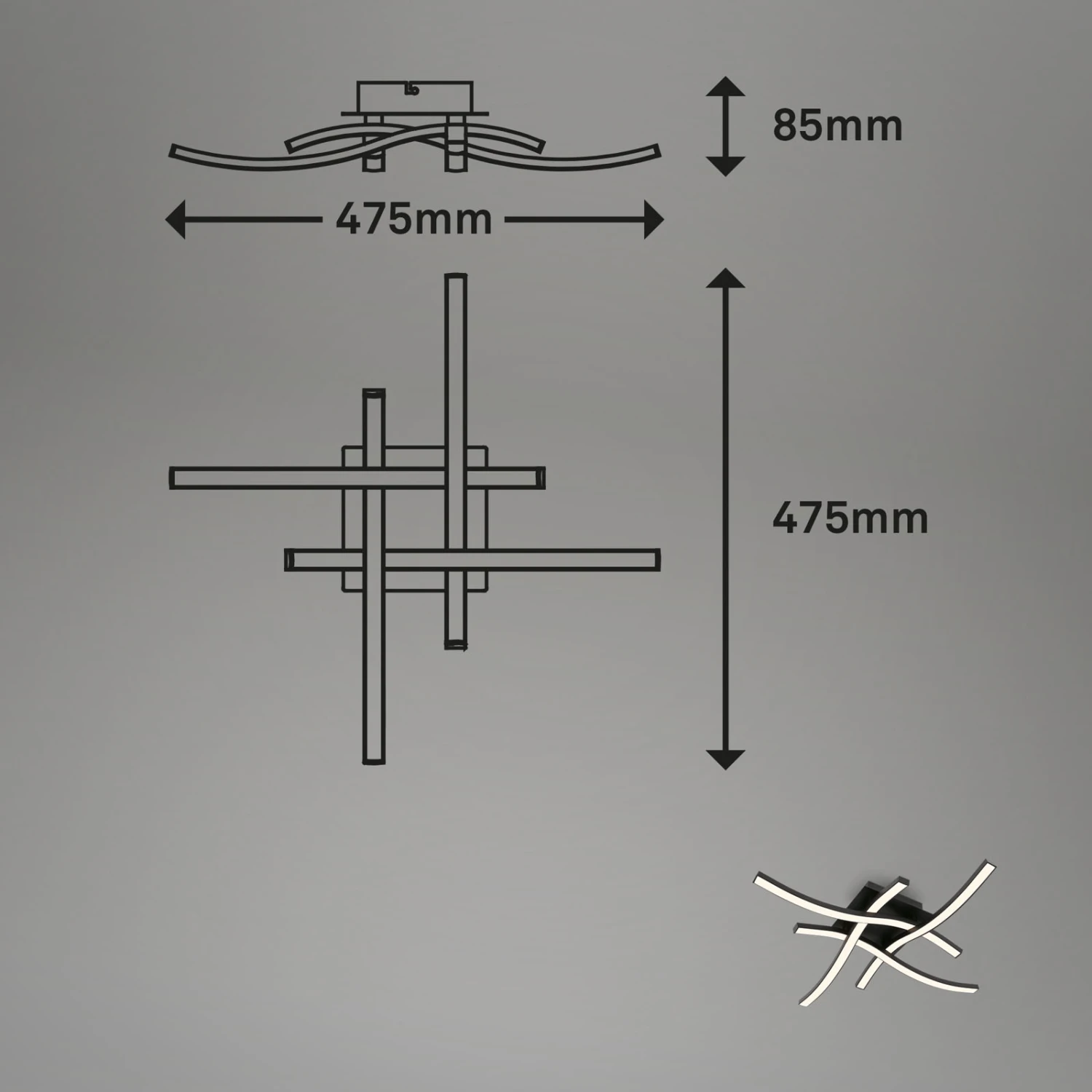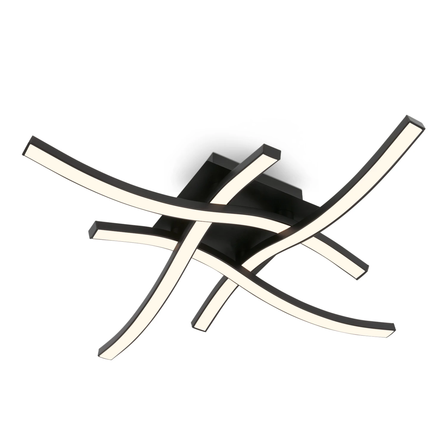 Das geschwungene, wellenförmige Design dieser LED Deckenlampe ist das Highlight dieser LED Leuchte. Die LED-Deckenleuchte eignet sich besonders gut als Schlafzimmerlampe, Flurlampe und Wohnzimmerlampe. Die LED-Wellenlampe liefert durch die 4 geschwungenen Streben einen schönen, warmweißen Lichtton bei 3.000 Kelvin. Eine hohe Lichtleistung wird mit 16 Watt und 1400 Lumen Helligkeit erreicht. 475x475x85 mm ist die Größe der Deckenleuchte (LxBxH). Die Produktfarbe ist Schwarz