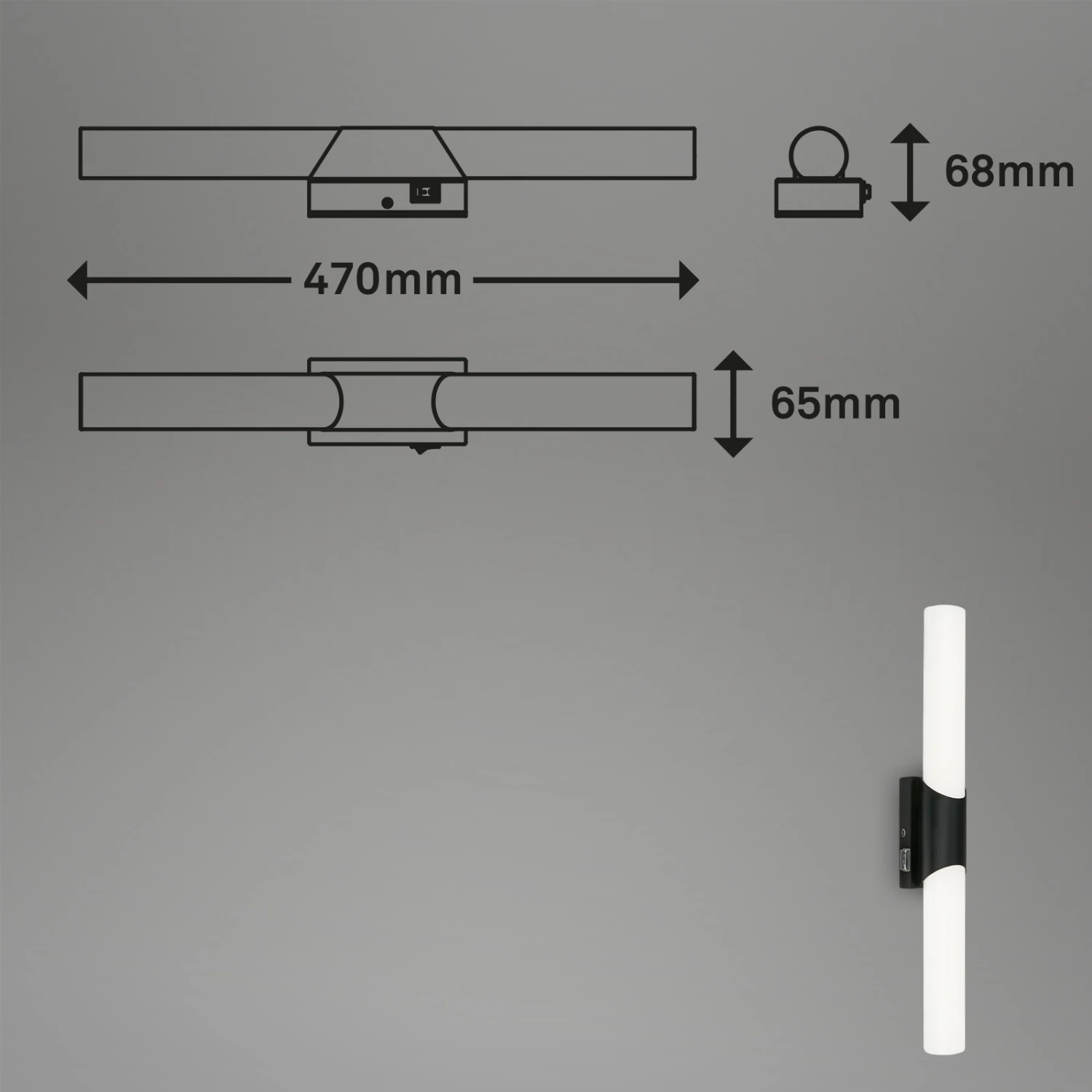 Die mattschwarze LED-Spiegelleuchte verfügt über eine IP44-Schutzzertifizierung und ist damit perfekt für Badezimmer und Gästebäder geeignet.Die spritzwassergeschützte Badezimmerleuchte kann an der Wand über oder neben Ihren Spiegel befestigt werden. Die Spiegellampe wird an das 230V Stromnetz angeschlossen und ist über einen integrierten Schalter steuerbar (kein Stecker). Das milchige Kunststoffgehäuse dient als Diffusor, der die Blendung verringert und die neutralweiße Farbtemperatur von 4000 Kelvin mit einer Helligkeit von 1300 Lumen verbreitet. Sie eignet sich hervorragend beim Auftragen von Make-up oder beim Rasieren. Außerdem kann die LED-Wandleuchte mit Schalter als Bilderleuchte verwendet werden. Sie ist 470x65x68 mm groß (BxTxH).
