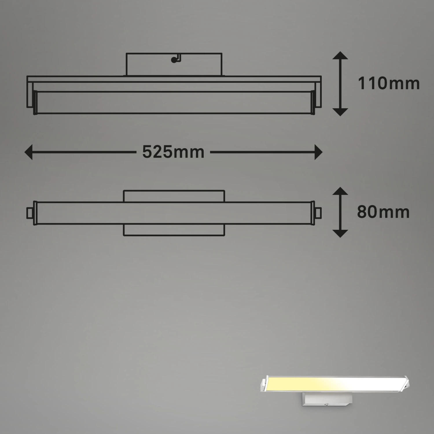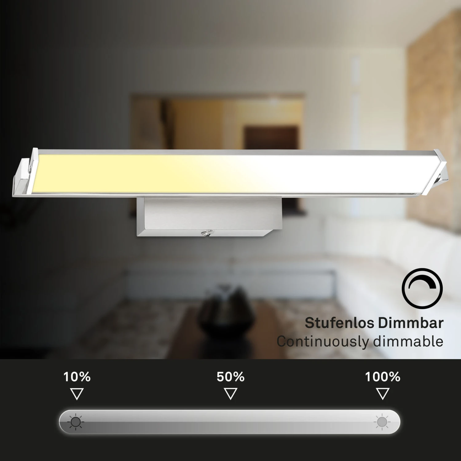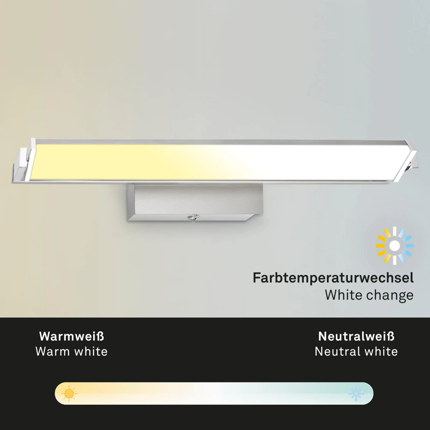 Die LED Platine ist um 360 Grad drehbar, was diesen LED-Wandstrahler einzigartig macht. Sorgen Sie für schöne Ambientebeleuchtung, indem Sie den Raum, ein beeindruckendes Gemälde an der Wand oder ein Bücherregal beleuchten. Die stufenlose Dimmbarkeit der Wandleuchte ermöglicht es Ihnen, die Helligkeit der Leuchte zu steuern. Durch langes Drücken des Touchfeldes können Sie die Helligkeit stufenlos erhöhen und verringern. Die Innenwandleuchte ist mit einer CCT-Farbtemperatursteuerung ausgestattet. Sie können die Lichtfarbe durch Berühren des Touch-Schalters in drei Stufen von Warmweiß bis Neutralweiß einstellen (2500K-4000K). Installieren Sie die 15-Watt-LED-Wandlampe mit 1800 Lumen im Flur, Diele oder Schlafzimmer als Spiegelleuchte. Die Abmessungen des Produkts betragen 526x80x96 mm (LxBxH).