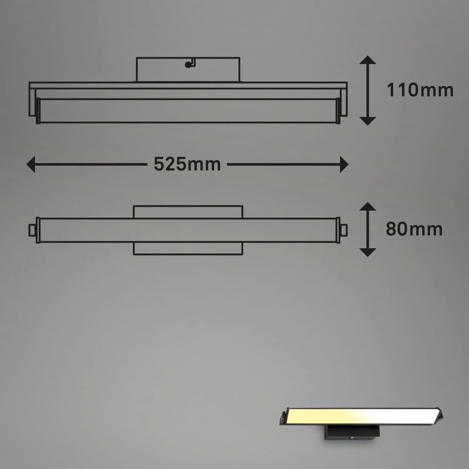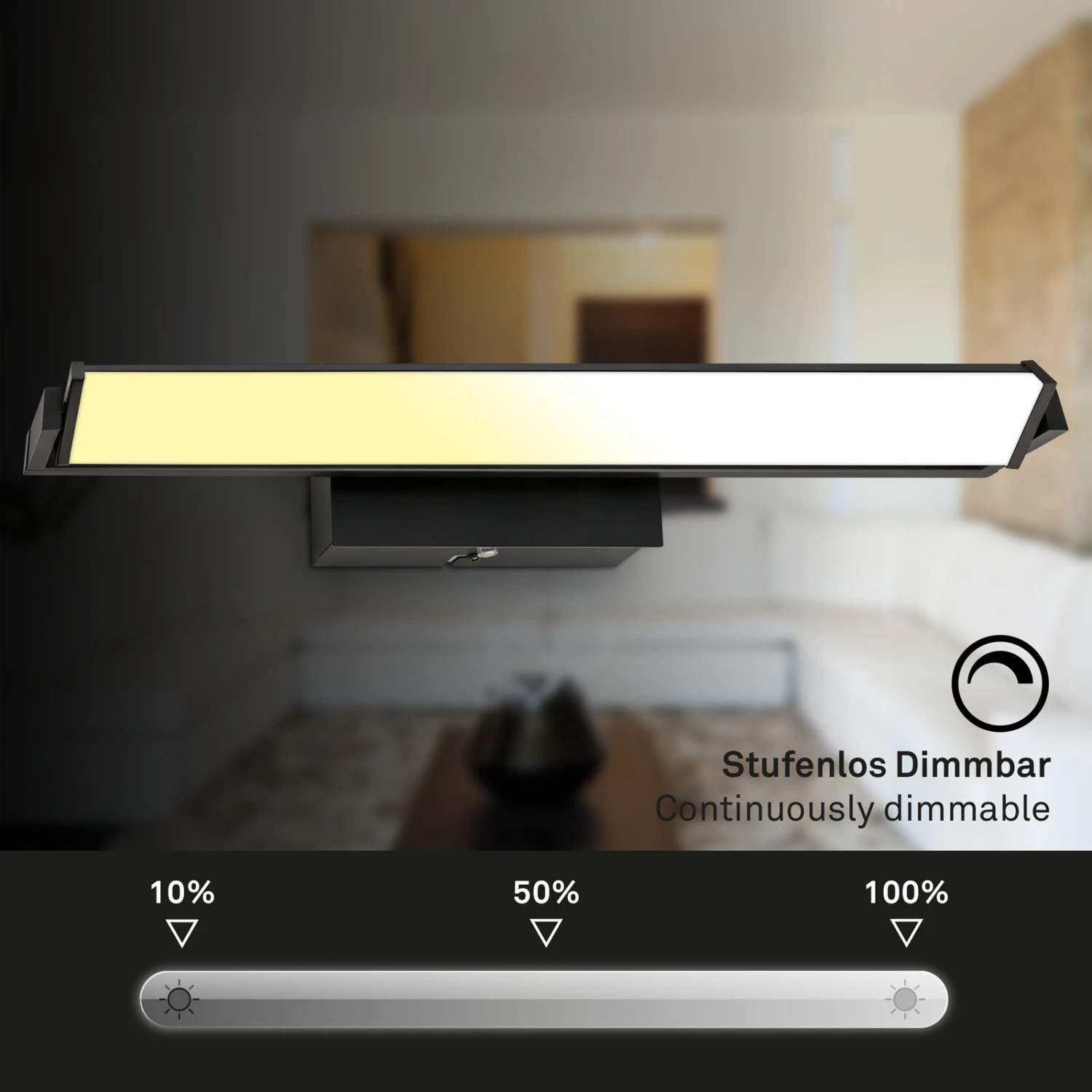 Die LED Platine ist um 360 Grad drehbar, was diesen LED-Wandstrahler einzigartig macht. Sorgen Sie für schöne Ambientebeleuchtung, indem Sie den Raum, ein beeindruckendes Gemälde an der Wand oder ein Bücherregal beleuchten. Die stufenlose Dimmbarkeit der Wandleuchte ermöglicht es Ihnen, die Helligkeit der Leuchte zu steuern. Durch langes Drücken des Touchfeldes können Sie die Helligkeit stufenlos erhöhen und verringern. Die Innenwandleuchte ist mit einer CCT-Farbtemperatursteuerung ausgestattet. Sie können die Lichtfarbe durch Berühren des Touch-Schalters in drei Stufen von Warmweiß bis Neutralweiß einstellen (2500K-4000K). Installieren Sie die 15-Watt-LED-Wandlampe mit 1800 Lumen im Flur, Diele oder Schlafzimmer als Spiegelleuchte. Die Abmessungen des Produkts betragen 526x80x96 mm (LxBxH).
