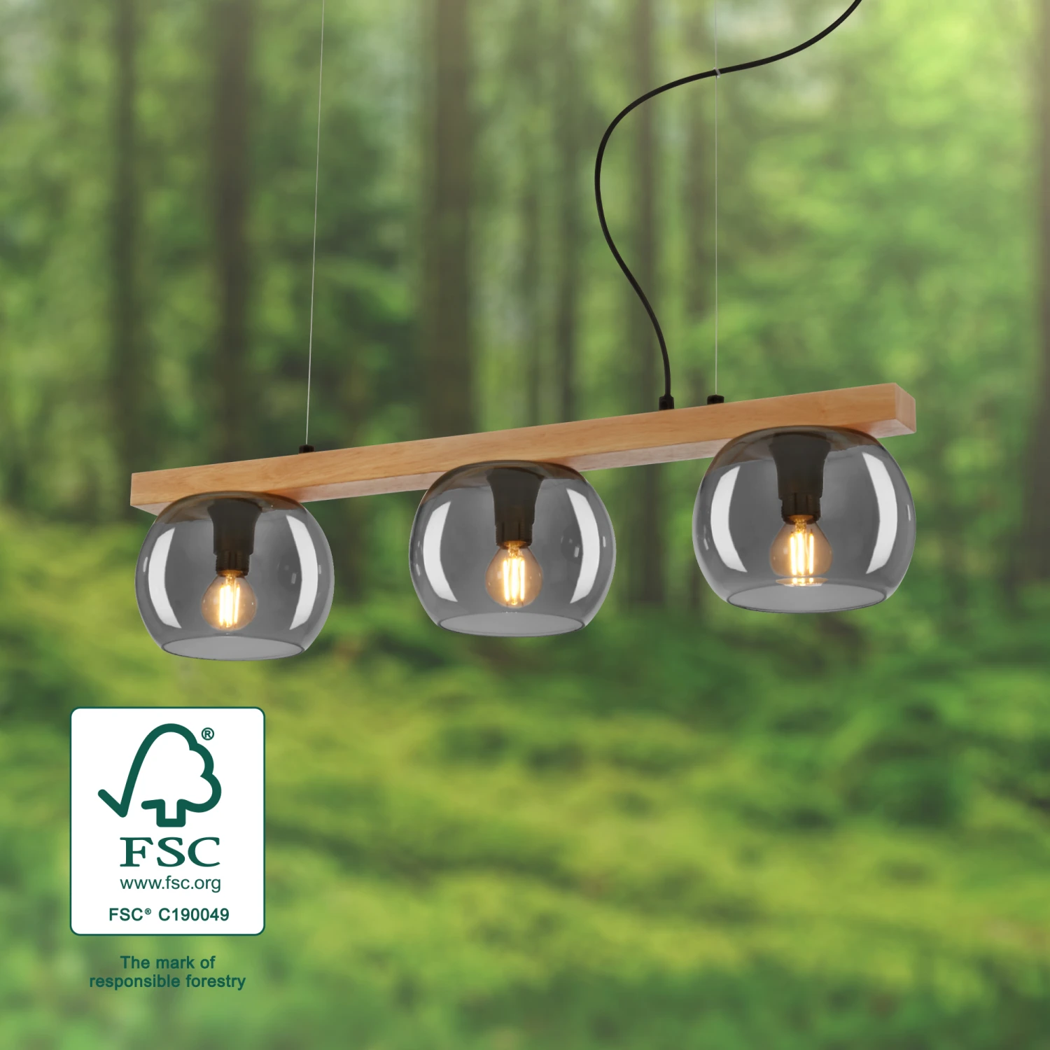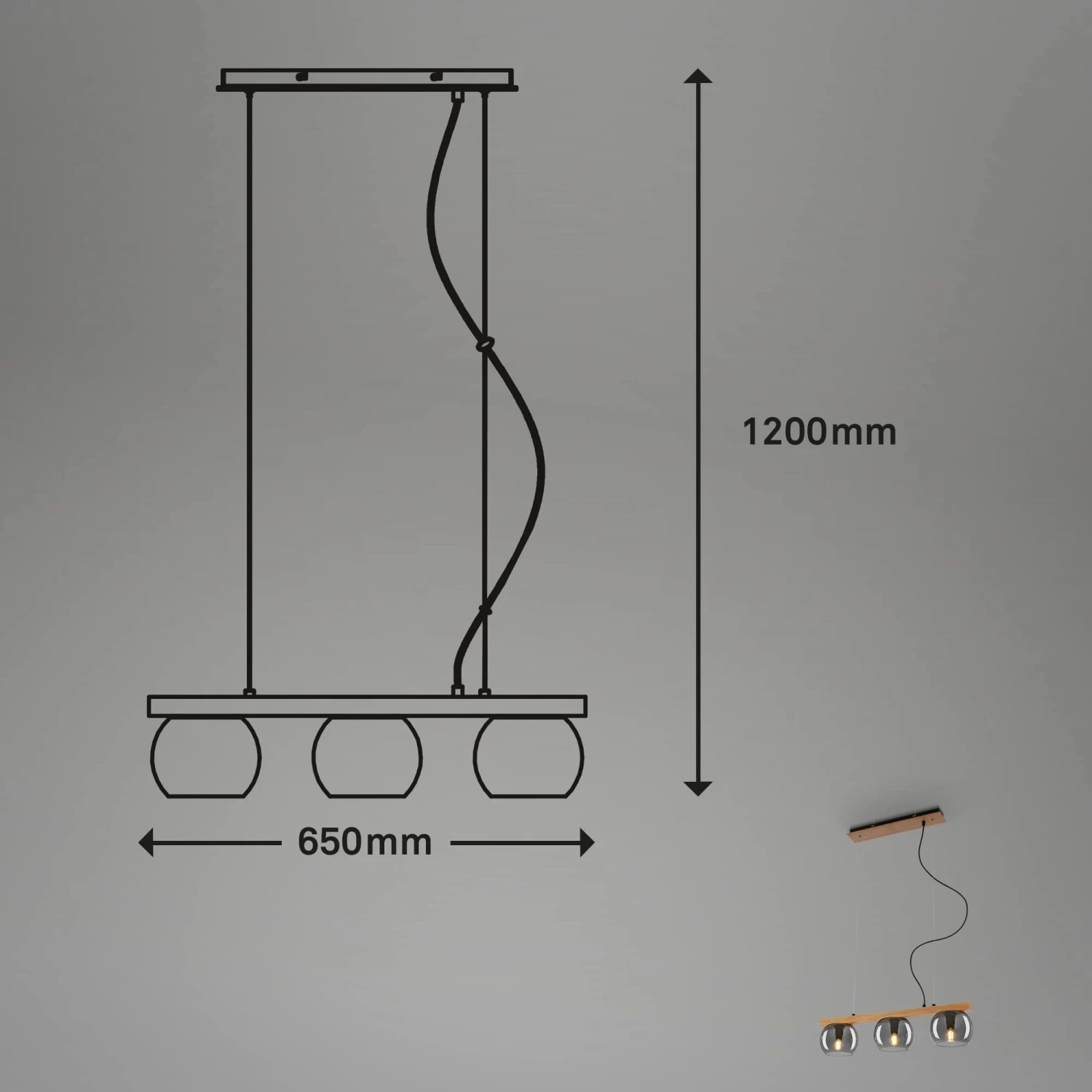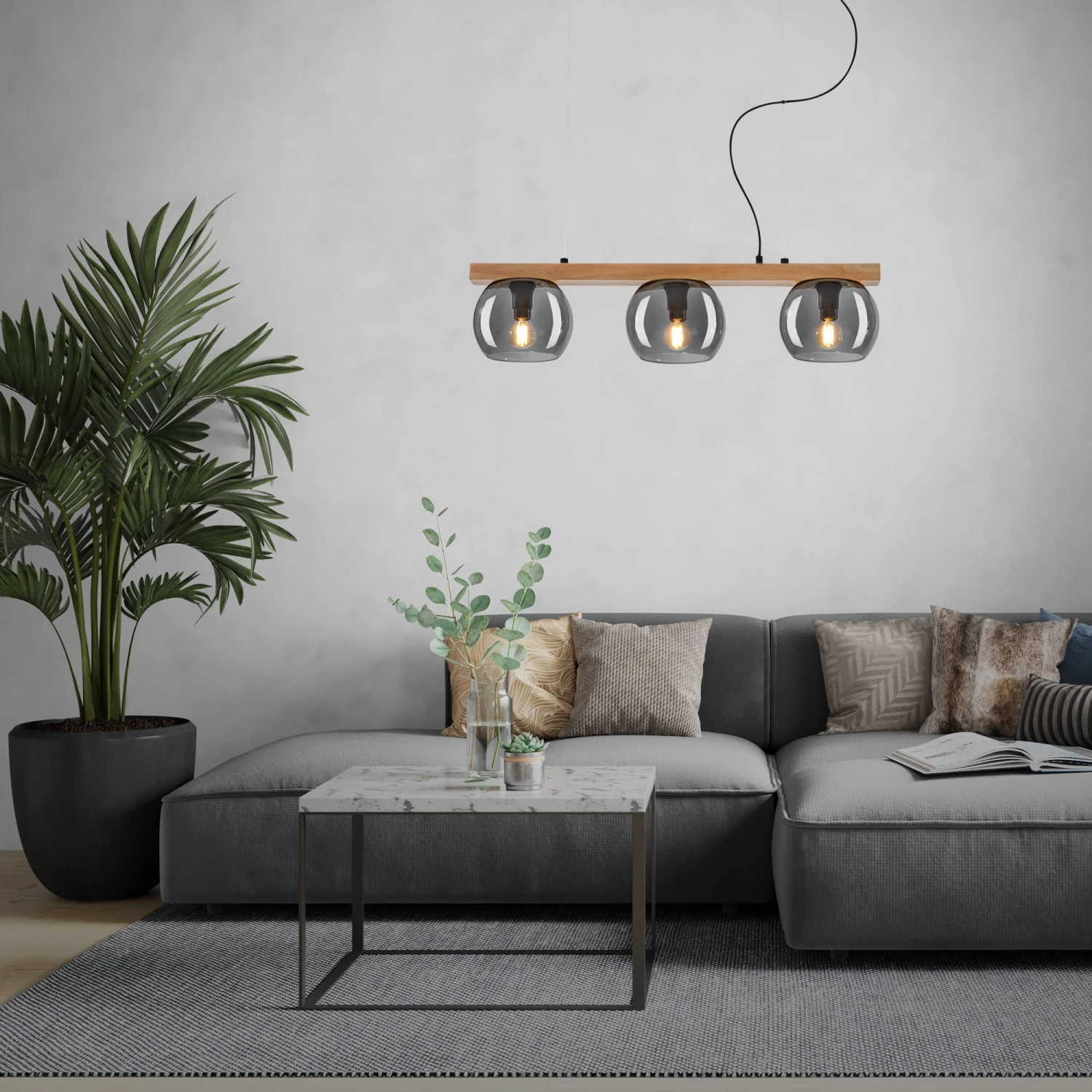 Elegantes Rauchglas-Design: Unsere 3-flammige Pendelleuchte mit Rauchglas-Schirmen schafft eine faszinierende Atmosphäre und zeitlose Eleganz in Ihrer Küche, Wohnzimmer, Schlafzimmer oder Esszimmer. Flexible Beleuchtungsoptionen: Die E14-Fassungen sind für Leuchtmittel bis zu 10 Watt geeignet. Um den coolen Vintage-Look der Deckenlampe zu erhalten, empfehlen wir stilvolle Retro-LED-Leuchtmittel. Harmonisches Materialmix: Schwarzes Metall, Glas und Holz in Rauchglas-Optik ergeben ein stimmiges Design, das sich nahtlos in verschiedene Einrichtungsstile integriert. Großzügige Abmessungen: Mit einer Größe von 650x160x1200mm (LxBxH) bietet diese Esszimmerlampe ausreichend Helligkeit für große Esstische und Wohnzimmertische. Hinweis: Leuchtmittel sind bei dieser Hängelampe nicht im Lieferumfang enthalten.