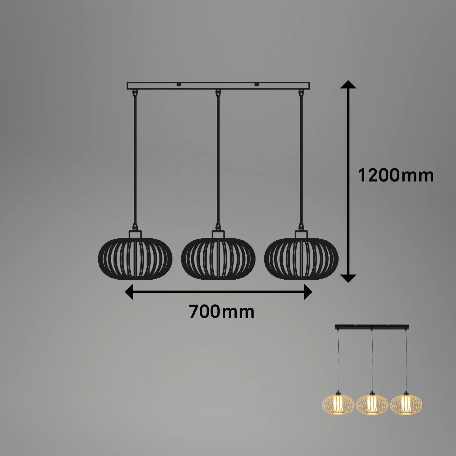 Verleihen Sie Ihrem Raum eine einzigartige Mischung aus Vintage-Charme und zeitloser Eleganz mit unserer exquisiten Hängelampe im Vintage-Stil. Ganz gleich, ob Sie Ihr Schlafzimmer, Wohnzimmer oder Esszimmer verschönern möchten, diese Pendelleuchte schafft eine einladende Atmosphäre, die Sie verzaubern wird. Die kunstvoll gestalteten Bambusschirme bringen einen Hauch von rustikalem Flair in Ihre Räumlichkeiten. Dieser 3-flammige Kronleuchter verwandelt Ihr Ambiente mit sanfter Beleuchtung und schafft eine Atmosphäre, in der Sie sich entspannen können. Die Bambusschirme der Deckenlampe verteilen das Licht gleichmäßig und zaubern eine beruhigende Umgebung, die perfekt für gemütliche Abende oder gesellige Zusammenkünfte ist. Die Hängelampe ist mit drei E27 Fassungen ausgestattet, was Ihnen die Freiheit gibt, das passende Leuchtmittel auszuwählen. Verwenden Sie ein Leuchtmittel mit einer maximalen Leistung von 10W, um die perfekte Beleuchtung zu erzielen (Leuchtmittel nicht im Lieferumfang enthalten). Mit ihren Maßen fügt sich diese Deckenleuchte harmonisch in Ihre Räume ein. Eine Gesamthöhe von 1200 mm und eine Länge von 700 mm, bei 280 mm Bambusschirmen, machen sie zur idealen Wahl für Ihre Küche, wo sie als Küchenlampe fungieren kann. Bringen Sie mit dieser Wohnzimmerlampe im Retrostil Wärme und Stil in Ihre Einrichtung und lassen Sie Ihre Räume im neuen Licht erstrahlen.