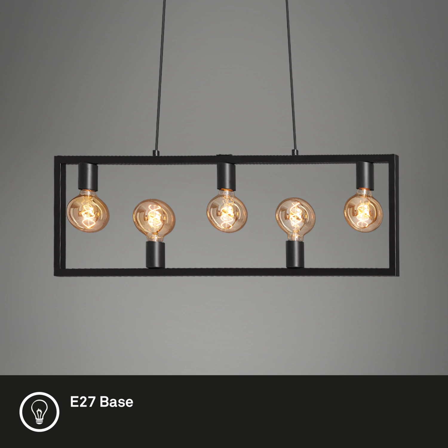 Diese Deckenleuchte in ihrem vintage Stil wird durch das schlichte schwarze Design ein Hingucker in Ihren Räumen. Gefertigt aus Metall fügt sich die Hängelampe perfekt in Wohnzimmer oder Esszimmer ein. Das Highlight der Pendelleuchte ist die Anordnung der Leuchtmittel innerhalb des großzügigen Rahmens. Die Wohnzimmerleuchte verfügt über fünf E27 Fassungen. Die maximale Wattage für die Lampen beträgt je 40 Watt. Lichtfarbe und Helligkeit können Sie hierbei selbst bestimmen