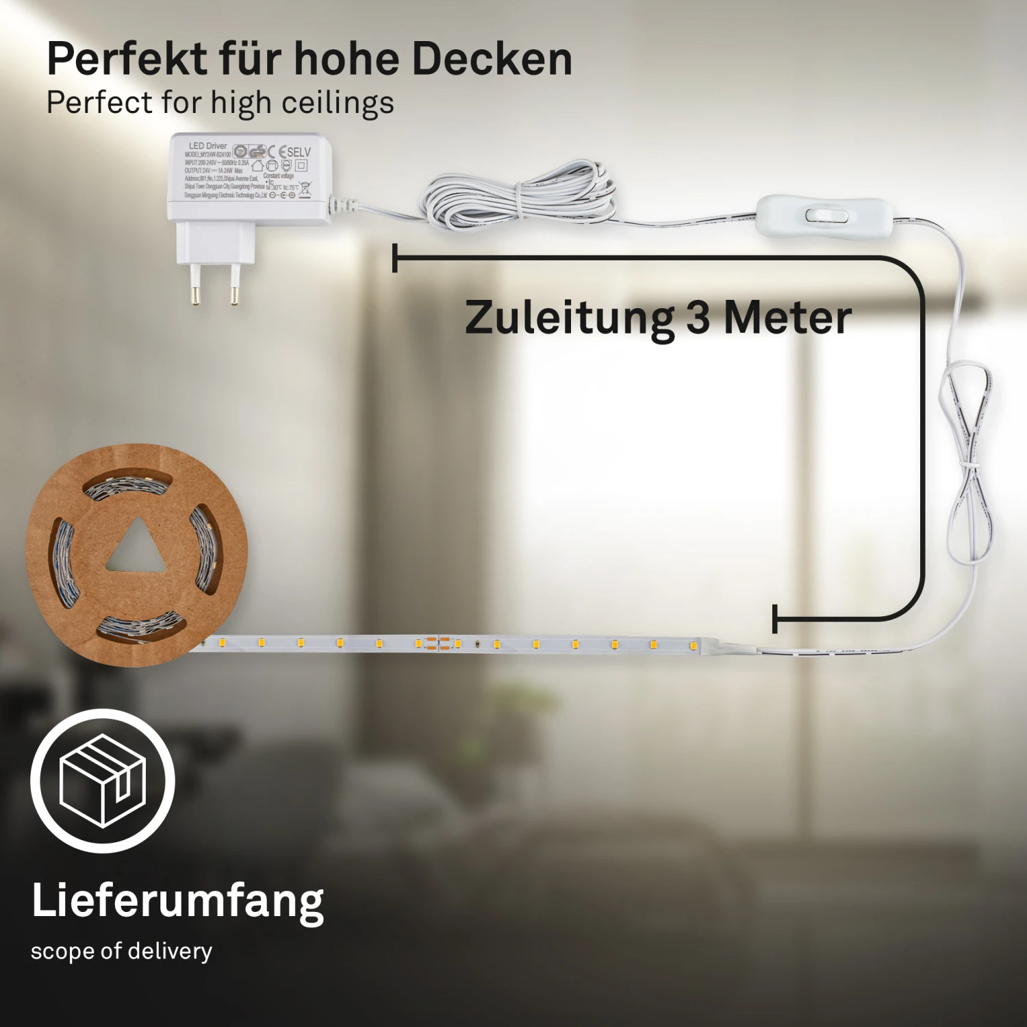 Die Installation gestaltet sich unkompliziert: Eine lange Zuleitung von 3 Metern, ermöglicht eine einfache Installation an hohen Decken. Mit dem 24V 1000mA Treiber und einem Kabelhalter ist das Set sofort einsatzbereit. Der Stripe kann alle 12,5 cm gekürzt werden, was eine individuelle Anpassung an die gewünschte Länge ermöglicht. Das am Streifen integrierte 3M-Klebeband sorgt für eine einfache und sichere Befestigung an Wänden, Decken oder im mitgelieferten Aluminiumprofil.