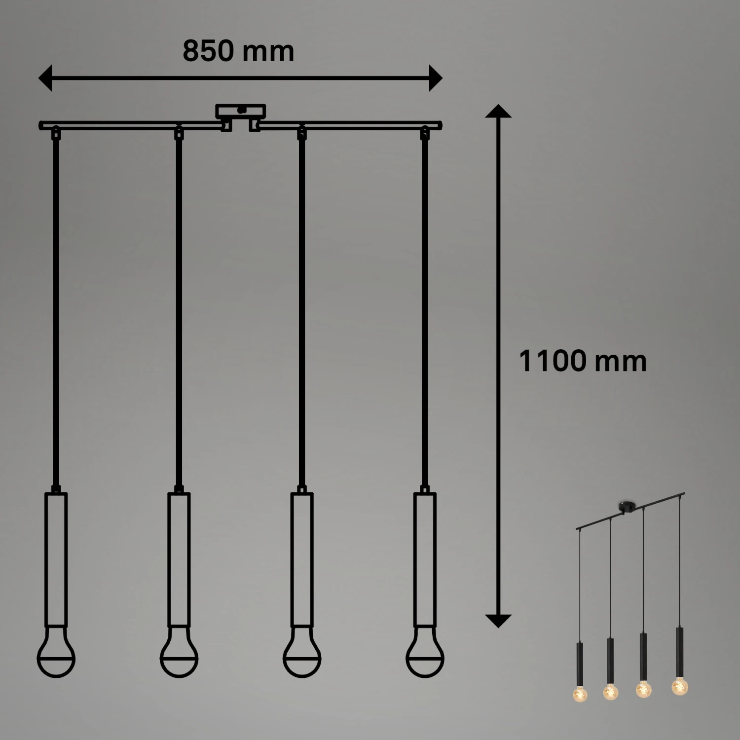 Die Deckenleuchte für das Esszimmer besticht durch ihren unverwechselbaren Vintage-Look und ihre matt-schwarze Farbe. An dünnen, unauffälligen Kabeln schwingen vier Pendelleuchten von der Decke. Die Deckenlampe verfügt über vier zylindrische E27-Fassungen für Leuchtmittel bis zu 60 Watt. Für ein optisch ansprechendes Gesamtbild wird eine Vintage-Birne empfohlen. Eine Glühbirne ist nicht im Lieferumfang enthalten. Der Metallkörper dieser Wohnraumleuchte ist mattschwarz. Die Pendelleuchte ist aufgrund ihrer IP20-Schutzzertifizierung nur für den Innenbereich geeignet. Diese Lampe im modischen Vintagestil ist ideal für das Esszimmer. Sie würde auch im Wohnzimmer oder über der Kücheninsel gut aussehen. Die Black-Steel Pendelleuchte ist 850x100x1100 mm groß (LxBxH)