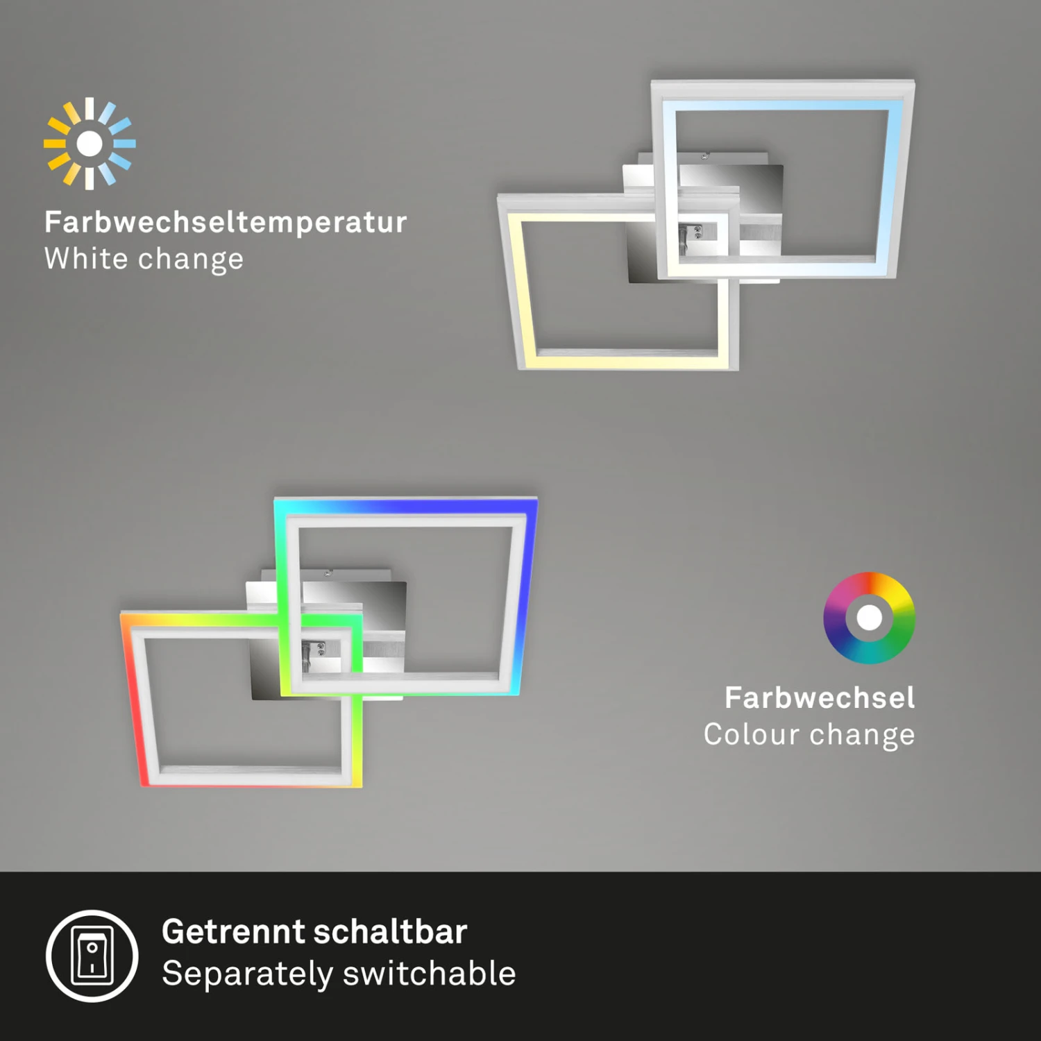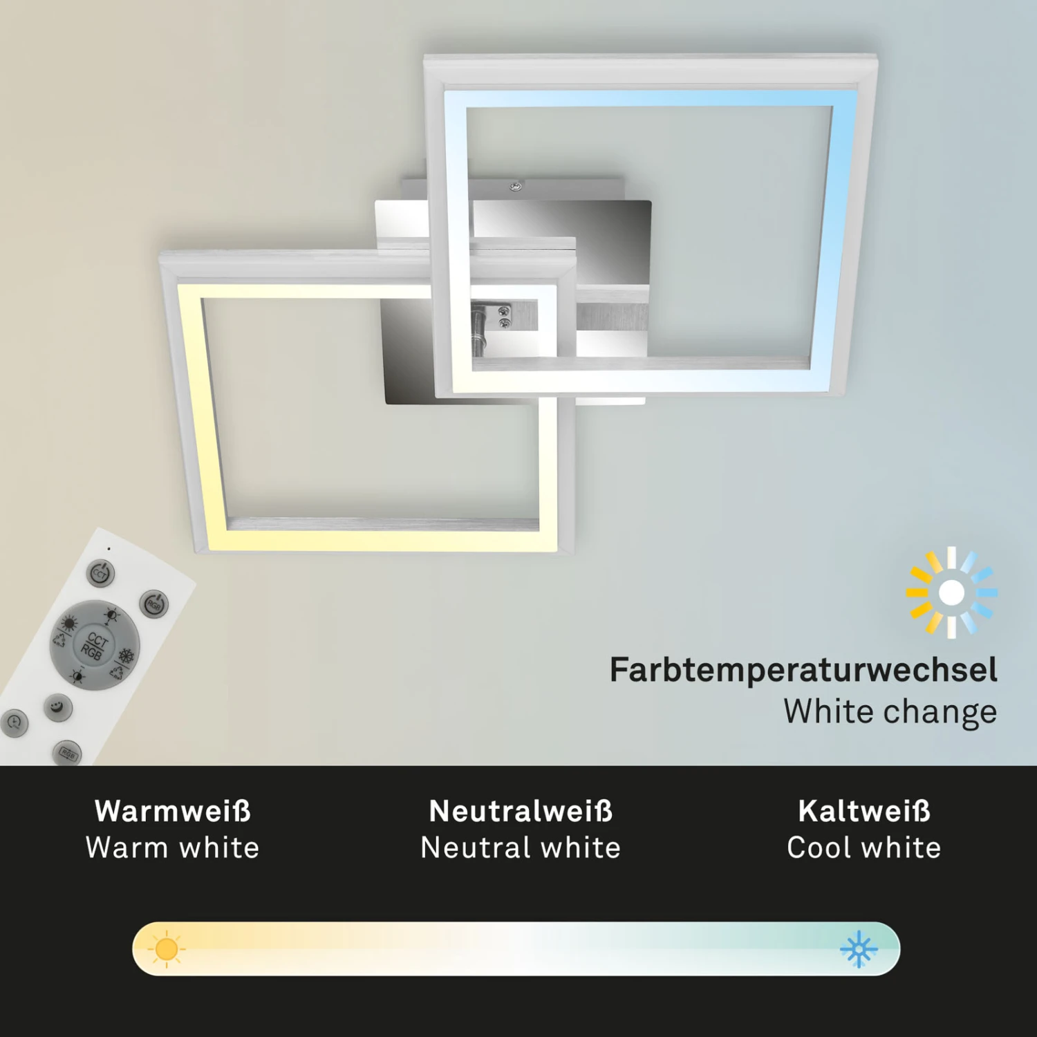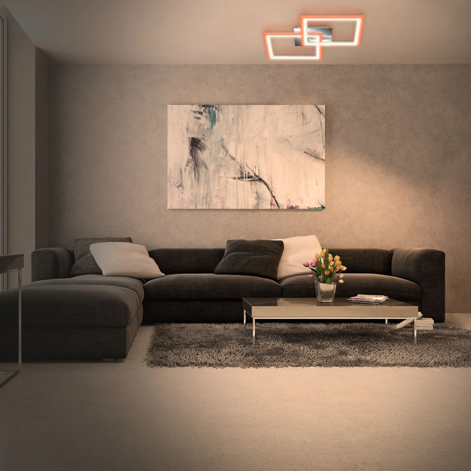 Die vielen Funktionen der 2-flammigen RGB-Deckenleuchte zeichnen sie aus. Die Rahmen können sowohl unabhängig voneinander als auch gleichzeitig in brillanten RGB-Farben und verschiedenen Weiß-Tönen geschaltet werden. Die Fernsteuerung macht den Vorgang einfach. Sie können die Geschwindigkeit der RGB-Lichteffekte steuern oder die Helligkeit der LED-Wohnzimmerleuchte nach Bedarf anpassen. Ein LED-Rahmen ist schwenkbar. Die Farbtemperatur der Weißtöne kann stufenlos von warmweißen 3000 Kelvin bis zu kaltweißen 6500 Kelvin eingestellt werden. Eine Nachtlichtfunktion dimmt das Licht auf eine niedrige Helligkeit bei warmweißen 3000 Kelvin. Für das nächste Einschalten speichert eine eingebaute Memory-Funktion die zuletzt gewählte Einstellung ab. Mit einem 30 Minuten Timer können Sie ein automatisches Abschalten der Leuchte bewirken. Mit den Maßen 605x365x85 mm (LxBxH) passt die Lampe perfekt in jedes Zuhause. Die Produktfarbe ist Chrom-Alu.