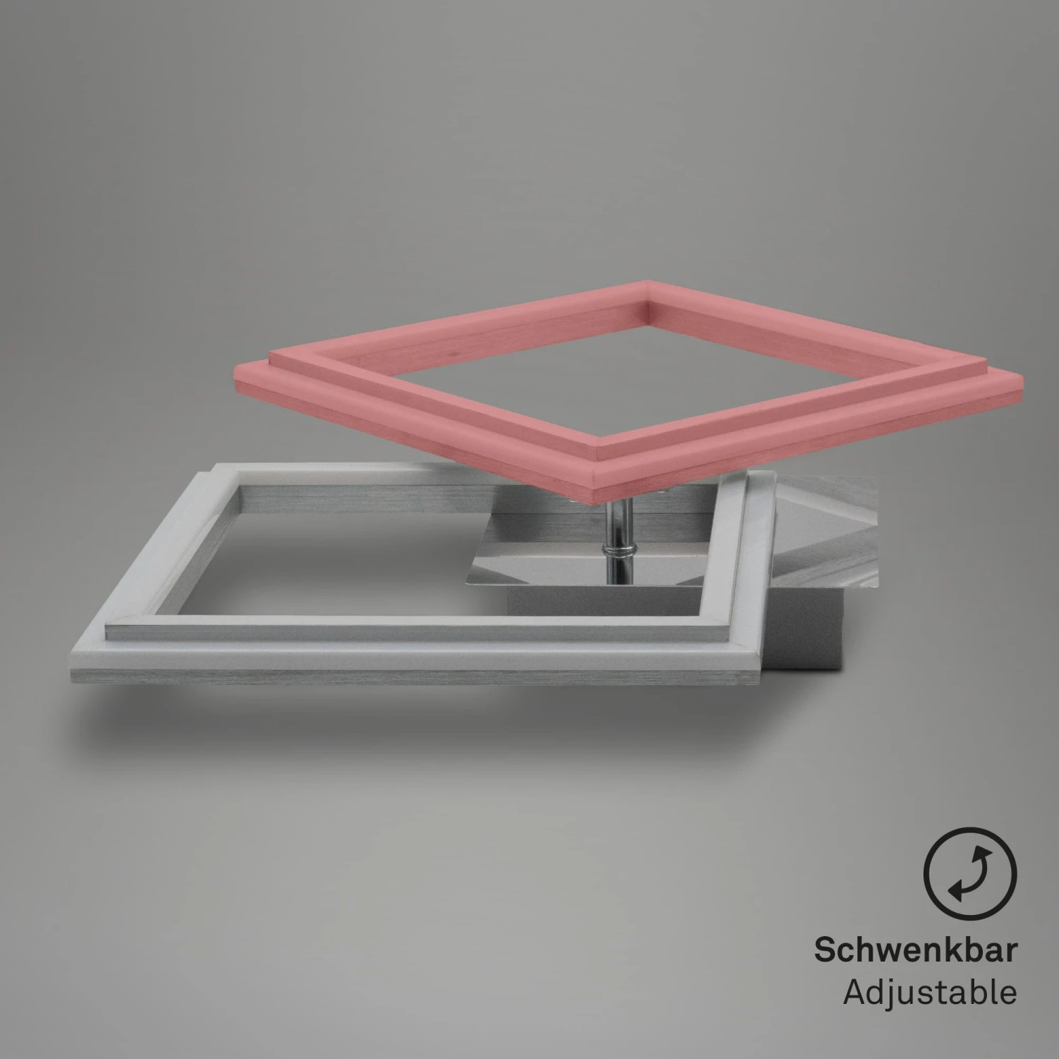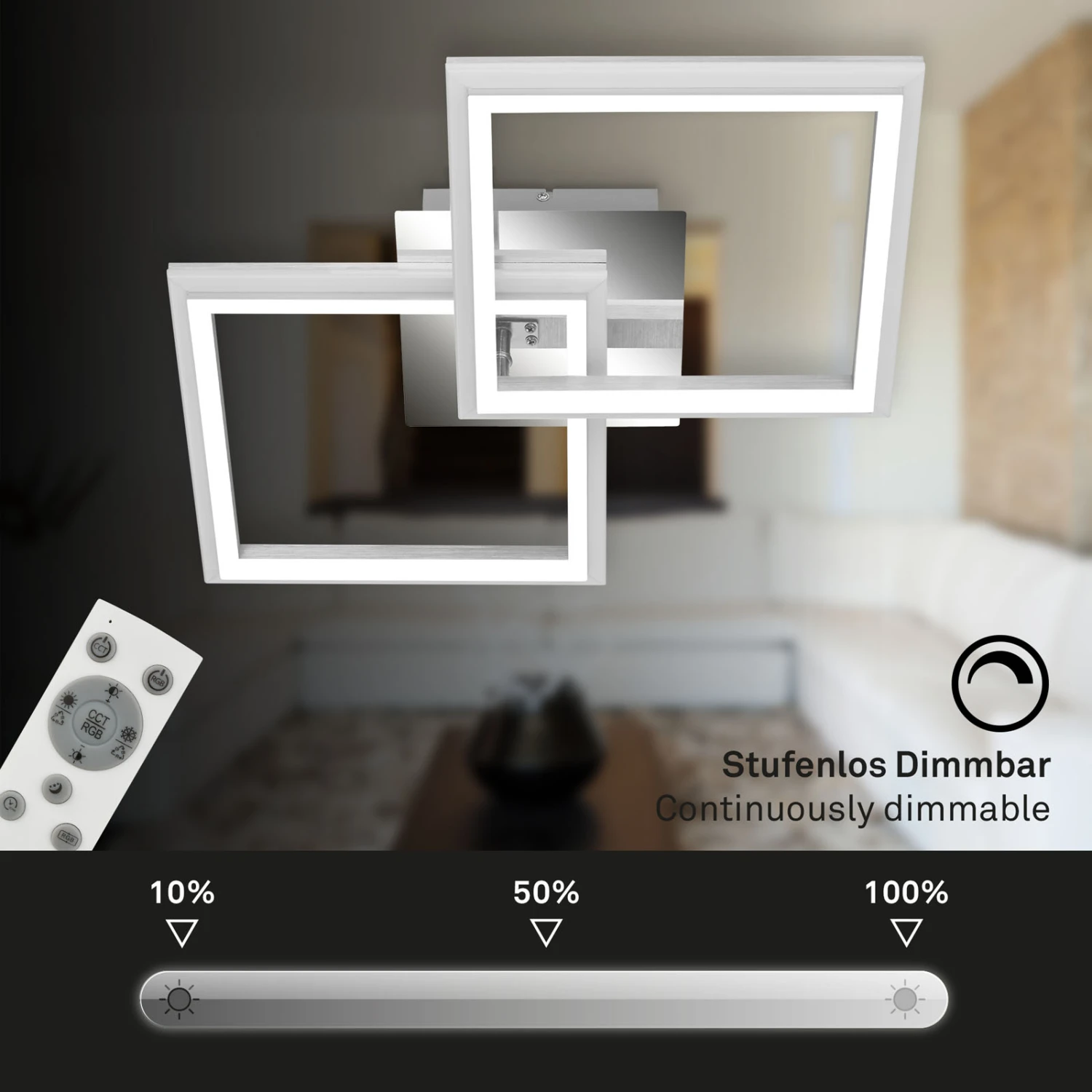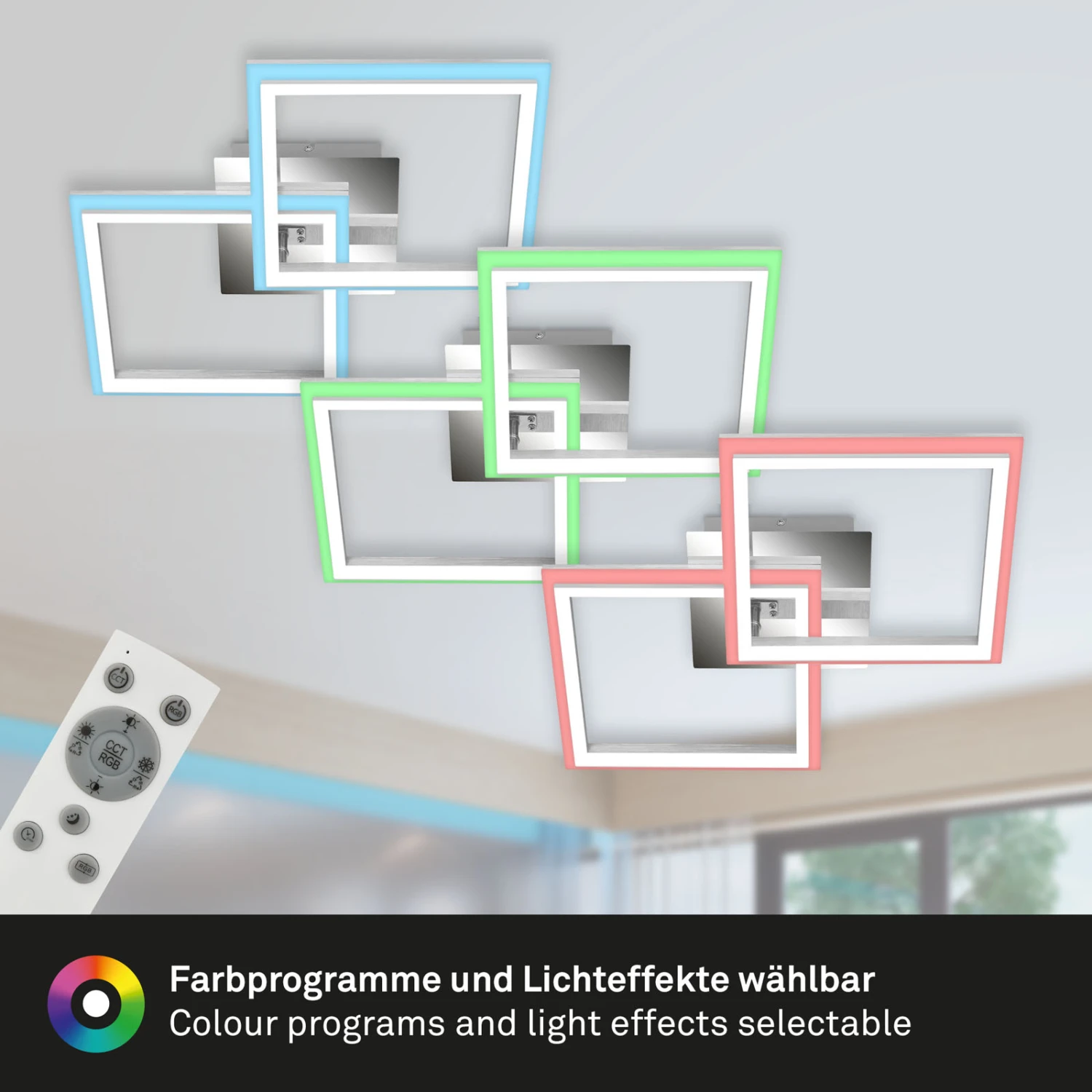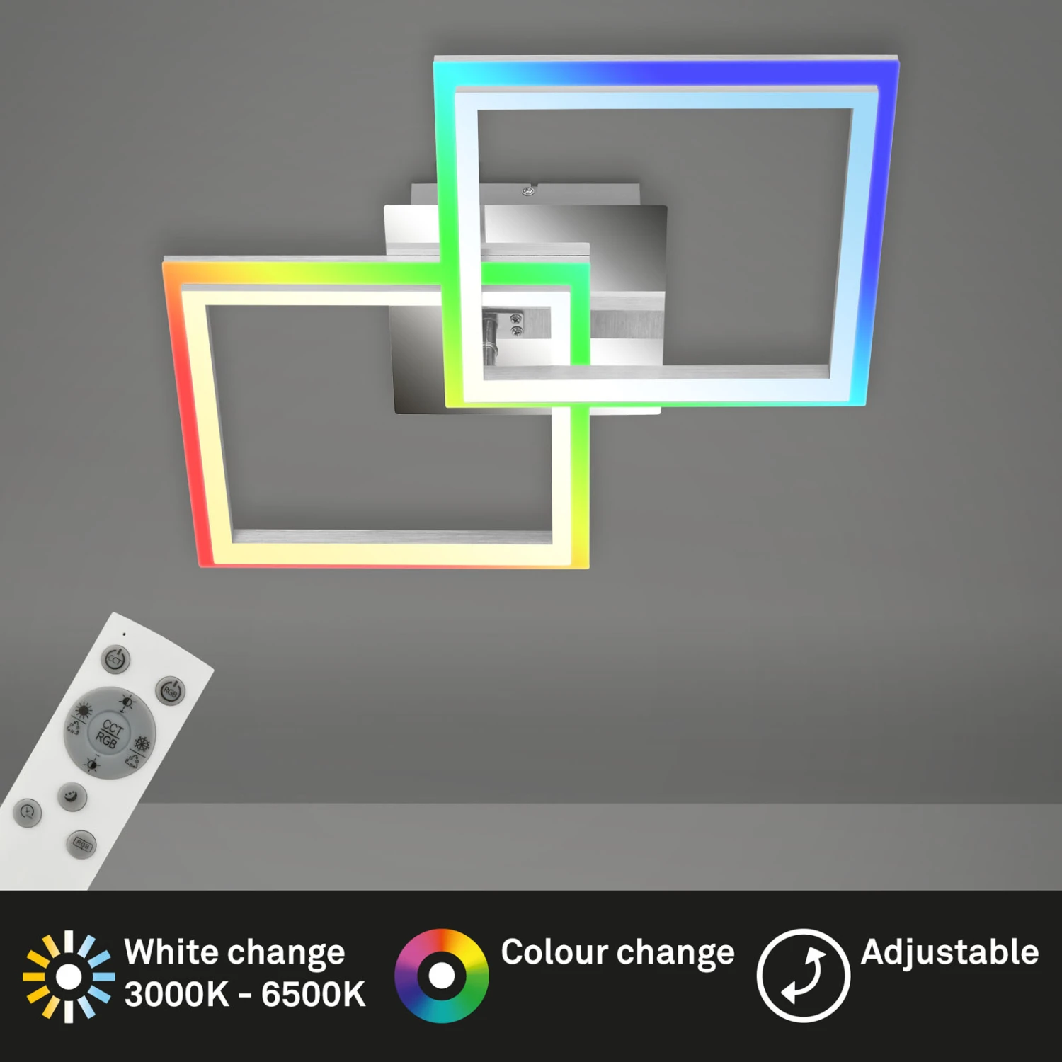 Die vielen Funktionen der 2-flammigen RGB-Deckenleuchte zeichnen sie aus. Die Rahmen können sowohl unabhängig voneinander als auch gleichzeitig in brillanten RGB-Farben und verschiedenen Weiß-Tönen geschaltet werden. Die Fernsteuerung macht den Vorgang einfach. Sie können die Geschwindigkeit der RGB-Lichteffekte steuern oder die Helligkeit der LED-Wohnzimmerleuchte nach Bedarf anpassen. Ein LED-Rahmen ist schwenkbar. Die Farbtemperatur der Weißtöne kann stufenlos von warmweißen 3000 Kelvin bis zu kaltweißen 6500 Kelvin eingestellt werden. Eine Nachtlichtfunktion dimmt das Licht auf eine niedrige Helligkeit bei warmweißen 3000 Kelvin. Für das nächste Einschalten speichert eine eingebaute Memory-Funktion die zuletzt gewählte Einstellung ab. Mit einem 30 Minuten Timer können Sie ein automatisches Abschalten der Leuchte bewirken. Mit den Maßen 605x365x85 mm (LxBxH) passt die Lampe perfekt in jedes Zuhause. Die Produktfarbe ist Chrom-Alu.