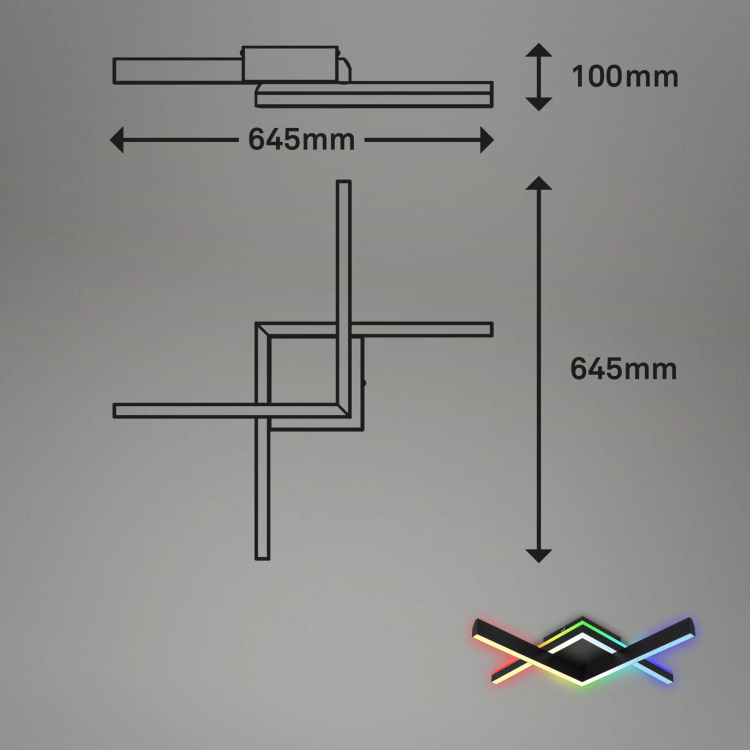 Die 2-flammige RGB-Kinderzimmerleuchte zeichnet sich durch ihre hochwertige Optik und mehrere Funktionen aus. Die Hintergrundbeleuchtung der beiden rechtwinkligen LED Leisten projiziert leuchtende RGB-Farben an die Wand oder Decke. Die Farbtemperatur des Frontlichts kann verändert werden, da die Wohnraumlampe über eine CCT-Funktion verfügt. Sie können das Tempo der RGB-Lichteffekte steuern oder die Helligkeit der LED-Wohnzimmerbeleuchtung nach Bedarf anpassen. Die LEDs können in 3 Arten angeschaltet werden: RGB Backlight einzeln, CCT Frontlight einzeln, beides gemeinsam. Die Fernbedienung macht es einfach, alles zu steuern. Wählen Sie aus einer Vielzahl von lebendigen Farbwechseln und Lichteffekten sowie einem Farbtemperaturbereich von warmweiß bis kaltweiß (2700K-6500K). Die Nachtlichtfunktion dimmt das Licht sanft herab und lässt die LED Wandleuchte in einem gemütlichen, warmweißen Lichtton leuchten. Ein 30 Minuten Timer schaltet das Licht der LED Wohnzimmerlampe automatisch aus. Die zuletzt eingestellten Parameter werden durch eine Memoryfunktion automatisch gespeichert und beim nächsten Einschalten direkt wieder angewählt. 18 Watt bei 2000 Lumen erzeugen viel Helligkeit. Mit den Maßen 645x645x100 mm (LxBxH) passt die Lampe perfekt in jedes Zuhause. Die Produktfarbe ist Schwarz.