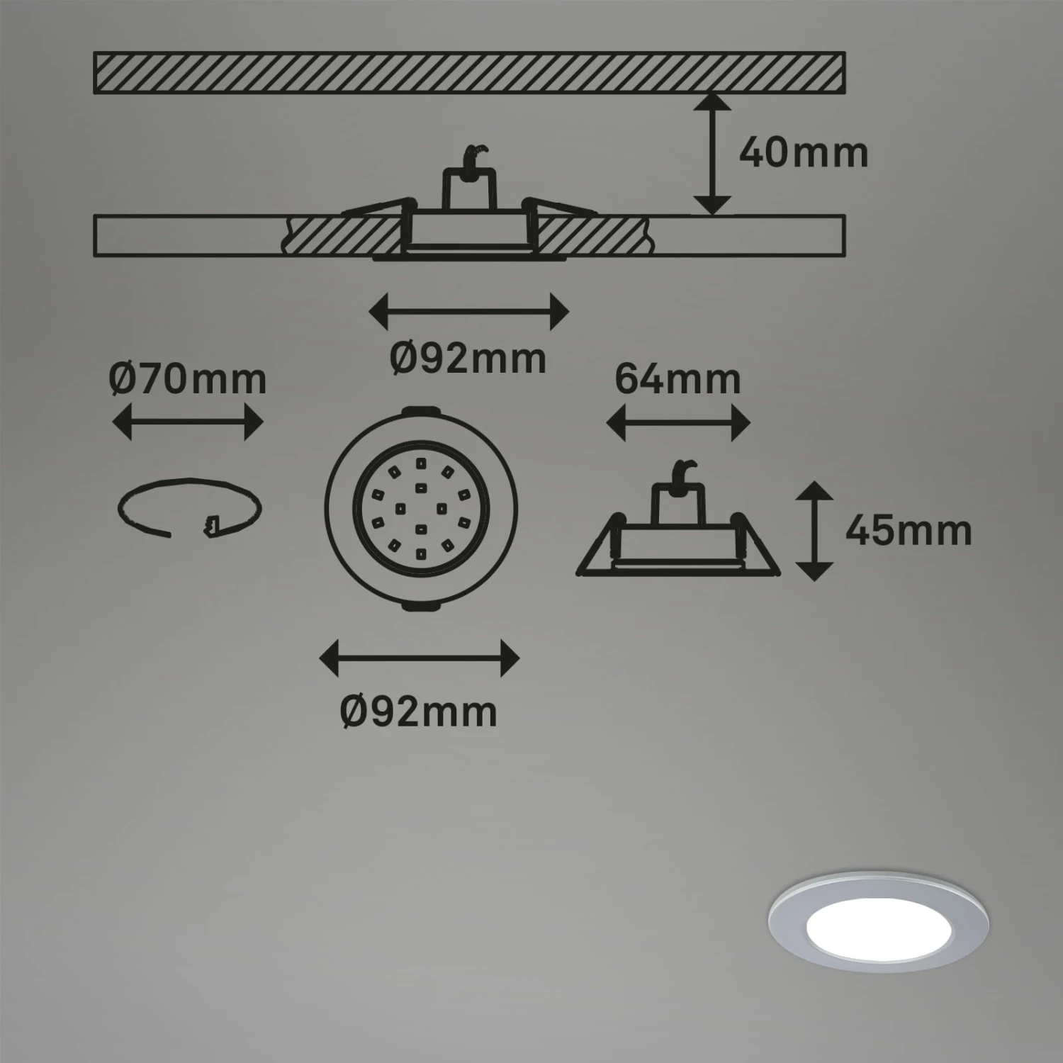 – und nach 23 Stunden wieder einschalten. Die Nachtlichtfunktion dimmt das Licht auf eine niedrige Dimmstufe und stellt eine warmweiße Farbtemperatur ein. So wird eine angenehme Atmosphäre in Schlafzimmer, Wohnzimmer oder Kinderzimmer geschaffen. Praktisch ist auch die Memoryfunktion, welche alle Einstellungen für das nächste Einschalten abspeichert. Die LED-Spots sind durch die Schutzart IP65 vor Strahlwasser geschützt. Die Deckeneinbauleuchten für das Badezimmer haben eine Größe von 92×45 mm, mit einem Einbaumaß von 68×40 mm. Mit je 4,8 Watt bei je 450 Lumen bieten die LED Einbaulampen viel Helligkeit. Die Produktfarbe ist Chrom-Matt.