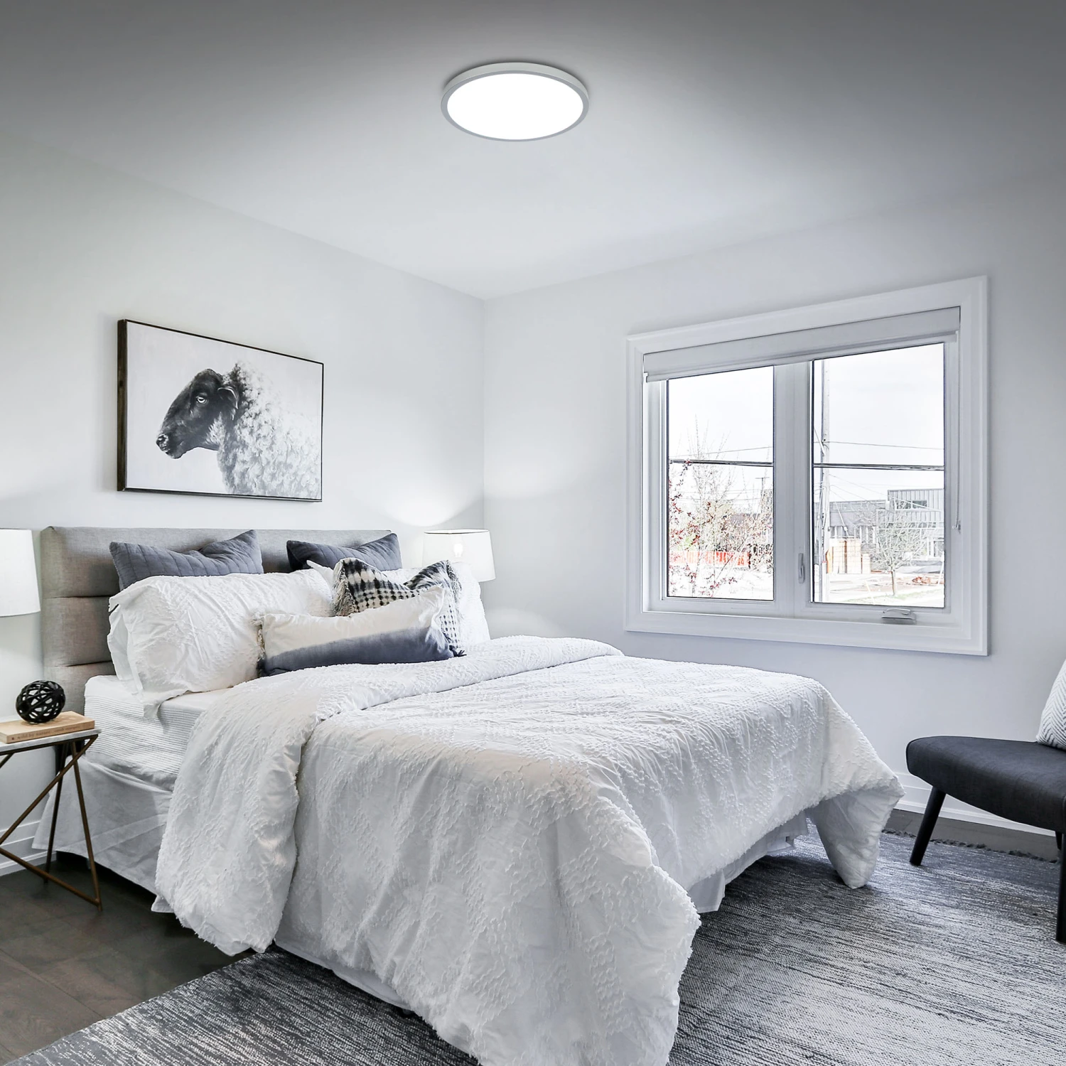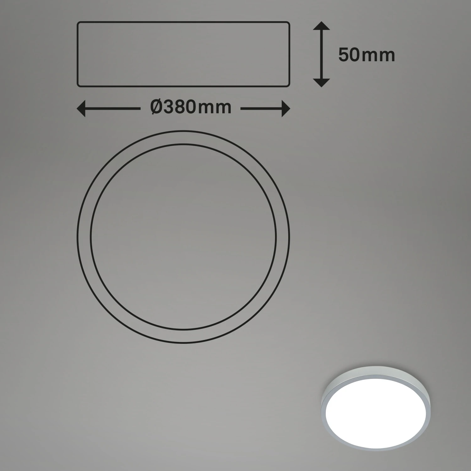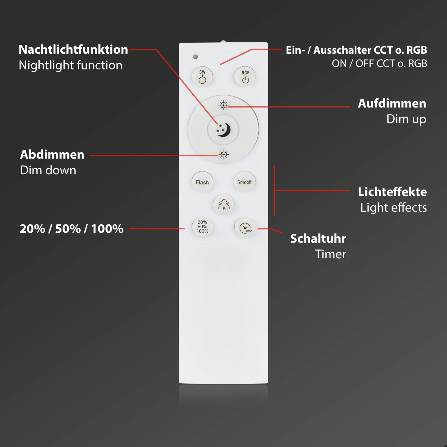 – und Schlafzimmer, denn sie verfügt über eine Nachtlichtfunktion (niedrigste Dimmstufe, warmweißes Licht), einen 30-Minuten-Timer und bunte Lichtfarben. Eine integrierte Memoryfunktion, speichert die per Fernbedienung gewählten Einstellungen für das nächste Einschalten via Wandschalter ab. Dadurch werden Ihre Parameter nach dem Ausschalten der LED Leuchte per Lichtschalter nicht zurückgesetzt. Mit einem Durchmesser von 380 mm und einer Höhe von 50 mm hat die LED-Deckenleuchte eine ansprechende Größe.