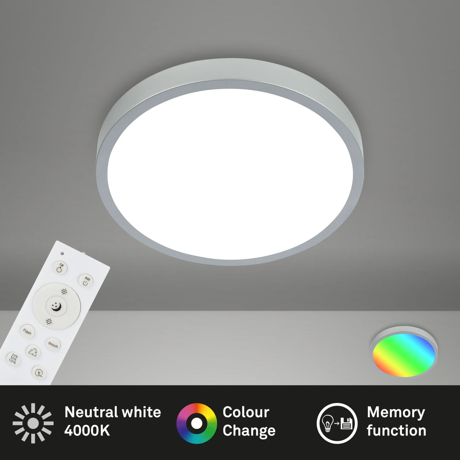 Im Mittelpunkt dieses silberfarbenen LED-Aufbaustrahlers steht die RGB-Funktion, die per Fernbedienung gesteuert wird und neben 7 festen Farben auch dynamische Farbwechsel ermöglicht. Eine neutralweiße Lichtfarbe von 4000K ist ebenfalls integriert. Alle Funktionen dieser LED-Aufbauleuchte lassen sich per Fernbedienung steuern. Dimmen Sie das Licht, wählen Sie aus mehreren Farboptionen, stellen Sie einen Timer ein oder schalten Sie das Nachtlicht ein. Die LED-Deckenleuchte ist ideal für das Kinder