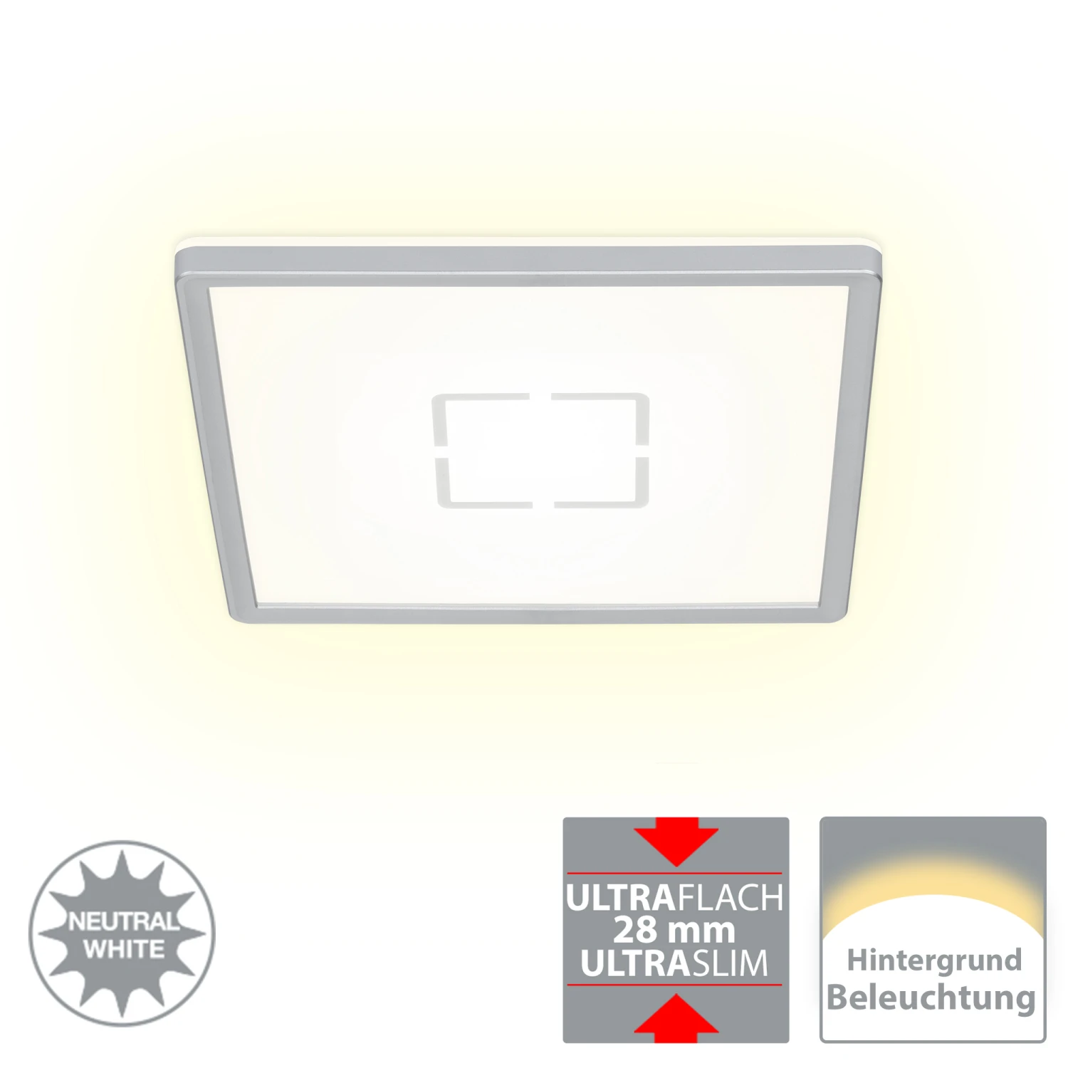 FREE Ultraflache LED Deckenleuchte mit Hintergrundbeleuchtungseffekt Kunststoff / weiß-silber inkl. 1 x LED Platine 12W 1.400lm 4.000K Lebensdauer 25.000h, Ra>=80 nicht dimmbar, inkl. indirektem Hintergrundbeleuchtungseffekt IP20 190x190x28mm (LxBxH)