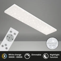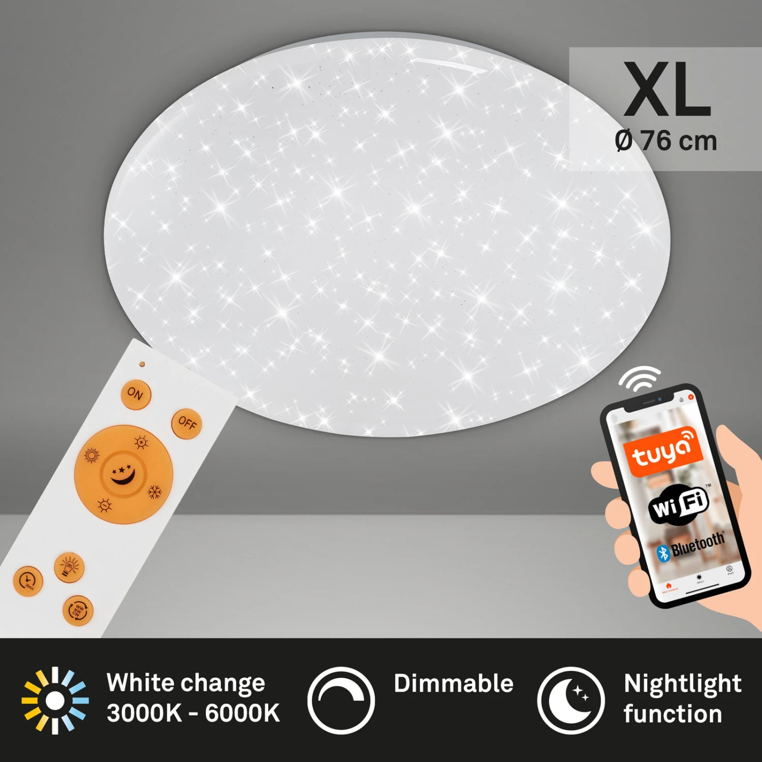Mit der vielseitigen LED Deckenleuchte können Sie jetzt eine stimmungsvolle Atmosphäre in jedem Raum schaffen. Die WLAN-fähige Lampe kann über die TUYA App oder die mitgelieferte Fernbedienung bequem gesteuert werden. Kompatibel mit Amazon Echo und Google Home, kann die Wohnzimmerlampe auch per Stimme gesteuert werden. Die Funktionen dieser Esszimmerlampe sind äußerst praktisch. Die CCT Funktion ermöglicht es Ihnen, eine beliebige Farbtemperatur zwischen 3.000K warmweiß und 6.500K kaltweiß zu wählen. Ganz nach Stimmung kann das Licht zudem gedimmt werden. Die 56 Watt und 5850 Lumen der Lampe sorgen für eine optimale Ausleuchtung in Flur, Küche, Büro, Schlafzimmer oder Wohnzimmer. Mit einer Größe von 760×105 mm (DxH) ist diese XXL LED Lampe vergleichsweise groß dimensioniert und eignet sich perfekt für den Einsatz im Wohn