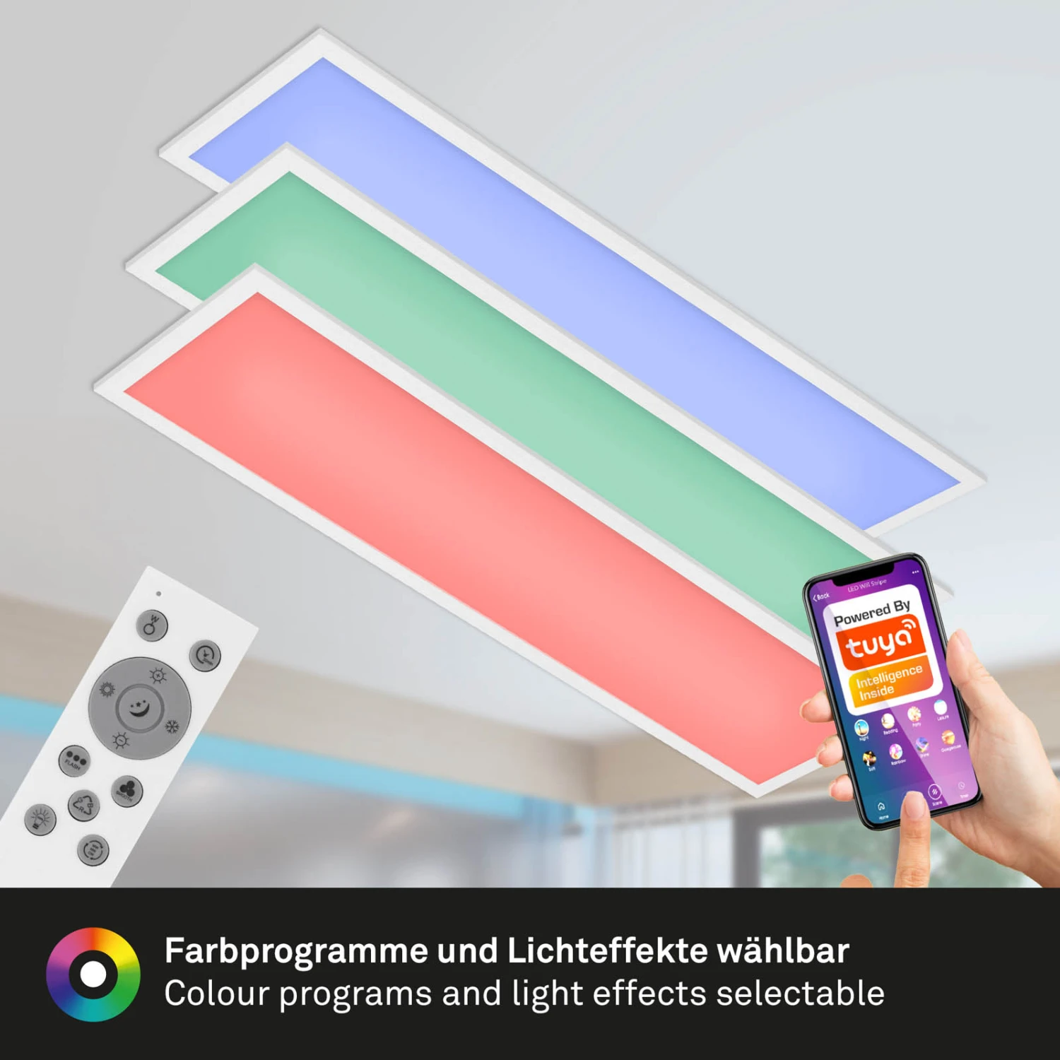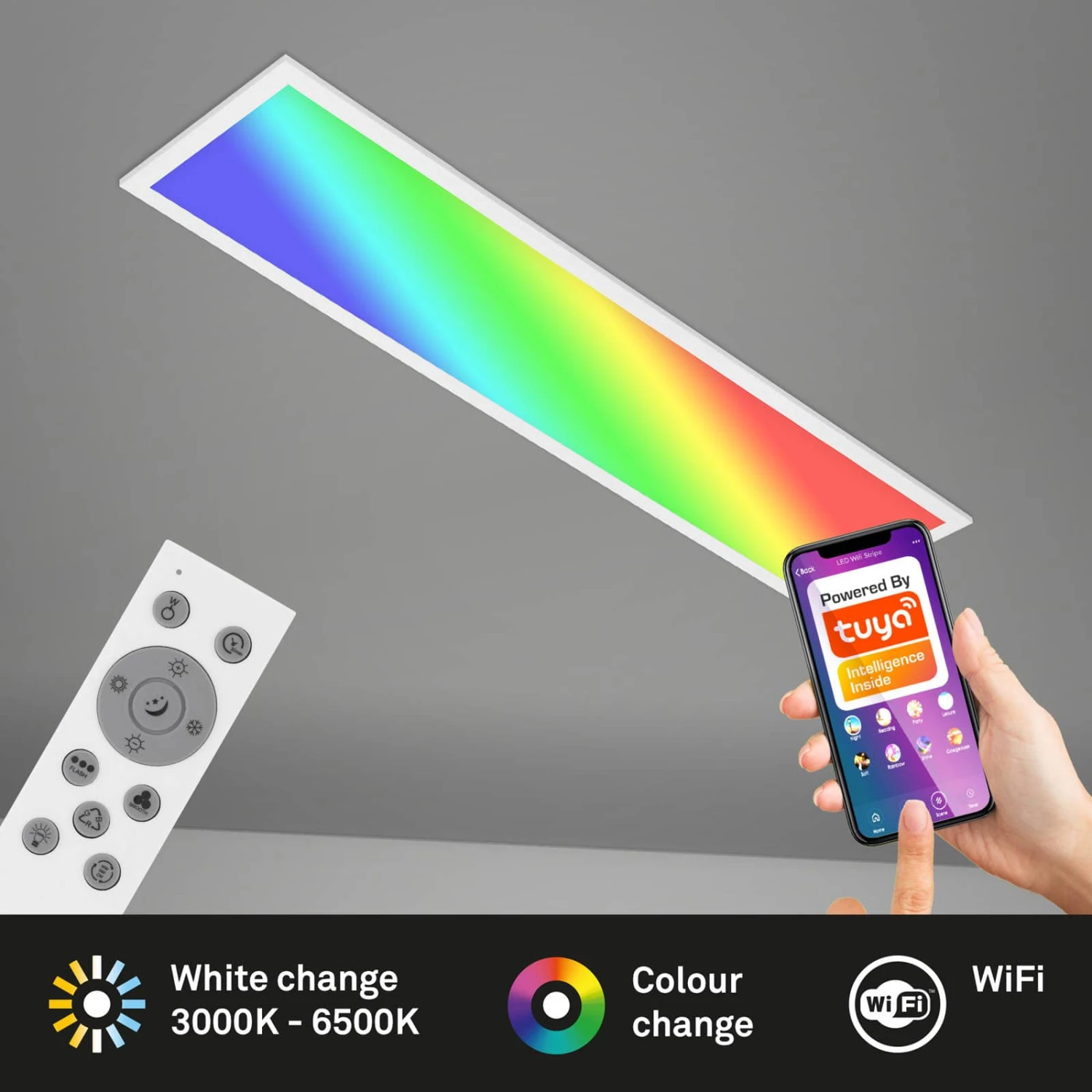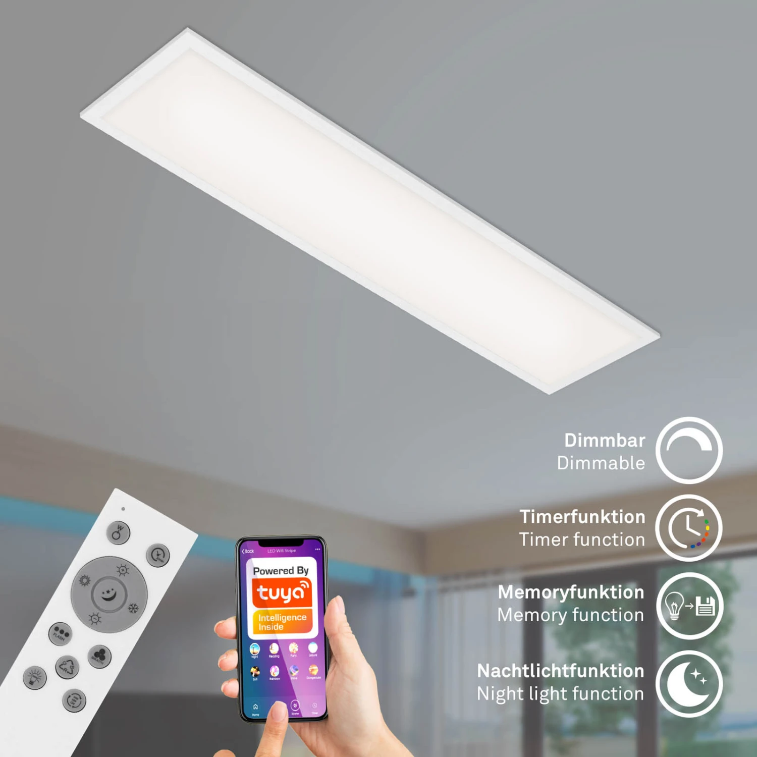 Diese smarte Deckenleuchte ist vielseitig einsetzbar z.B. als Wohnzimmerlampe oder Schlafzimmerleuchte. Per mitgelieferter Fernbedienung ist die Leuchte bequem vom Sofa aus anzusteuern. Besonders die Sprachsteuerung über Ihren Sprachassistenten, sowie die smarte Steuerung per App über Ihr Smartphone macht diese Leuchte besonders. Wählen Sie beispielweise Ihre liebste Farbtemperatur aus und passen Sie so die Lichtverhältnisse individuell an Ihre Bedürfnisse an (3000K Â? 6500K). Auch bunte Lichteinstellungen sind hier wählbar. Die ausgewählten Farbtemperaturen oder Lichtfarben werden durch die Memoryfunktion automatisch abgespeichert. Die Wohnzimmerlampe hat die Schutzart IP20. Produktabmessungen: 1000x250x65mm (LxBxH).