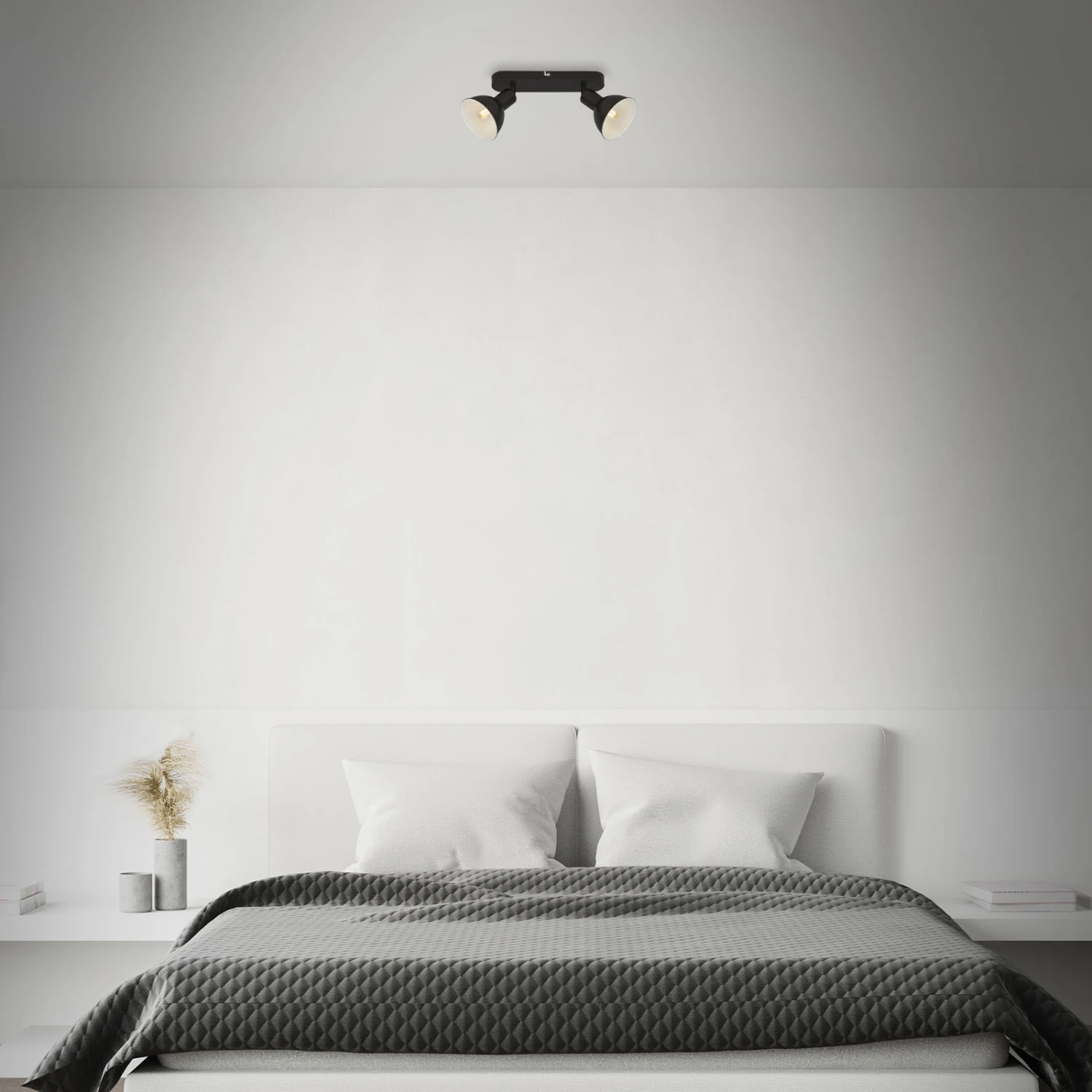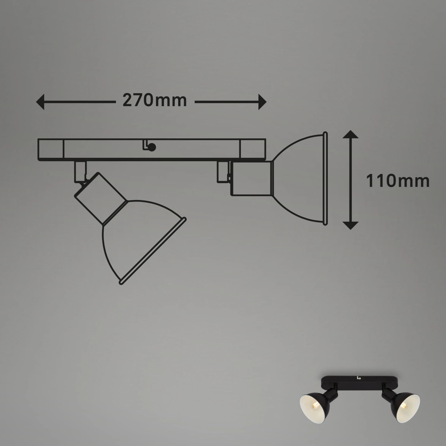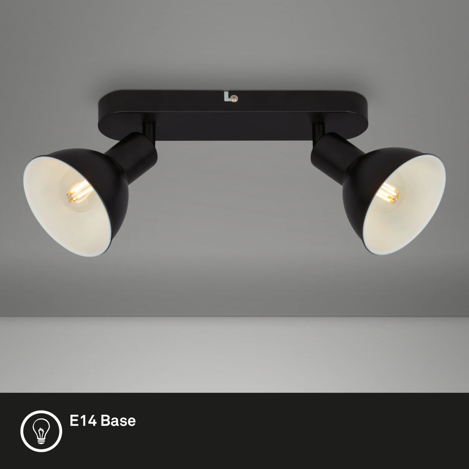 Für eine individuelle Beleuchtung sorgen die verstellbaren und schwenkbaren Lampenschirme der Deckenleuchte. Sie ist so vielseitig einsetzbar, dass sie als Wohnzimmerlampe, Flurlampe oder Schlafzimmerleuchte verwendet werden kann. Die Vintage Spotleuchte benötigt E14-Birnen mit einer maximalen Leistung von 25 Watt, die nicht im Lieferumfang enthalten sind. Diese vintage Deckenlampe zeichnet sich durch ihr Design aus. Die verstellbare Deckenbeleuchtung für zu Hause sticht optisch durch die schwarz-weiße Farbgestaltung hervor. Die 2 Lampenschirme des Deckenspots sind auf der Innenseite weiß und auf der Außenseite schwarz. Im Wohnzimmer, im Flur und im Schlafzimmer sieht der Spot fantastisch aus. Der Strahler hat ein längliches Design mit Produktabmessungen von 270 x 140 x 60 mm (LxHxB)
