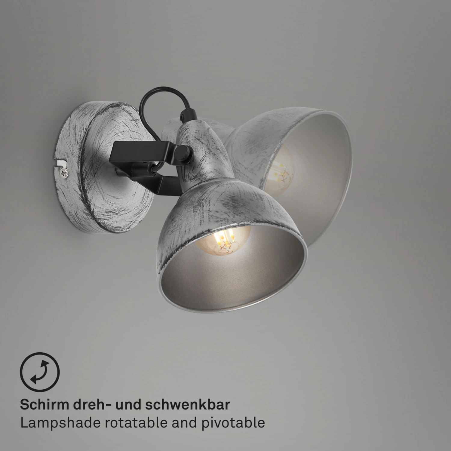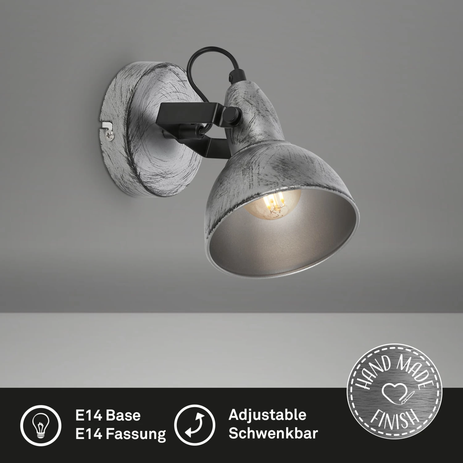Die individuelle Schwenkbarkeit der E14 Fassung, sowie die ansprechende Farbe in einem Antik-Silber (Silver Crafted) ist das Markenzeichen dieses Wandstrahlers. Durch die Verstellbarkeit des rustikalen Lampenschirms können Sie die Beleuchtung in Ihrem Wohnbereich beliebig gestalten. Die E14-Fassung des Strahlers nimmt Glühbirnen mit bis zu 40 Watt auf. Für ein optisch stimmiges Gesamtbild empfiehlt sich ein Retro-Leuchtmittel. Der antik-silberne, schwenk