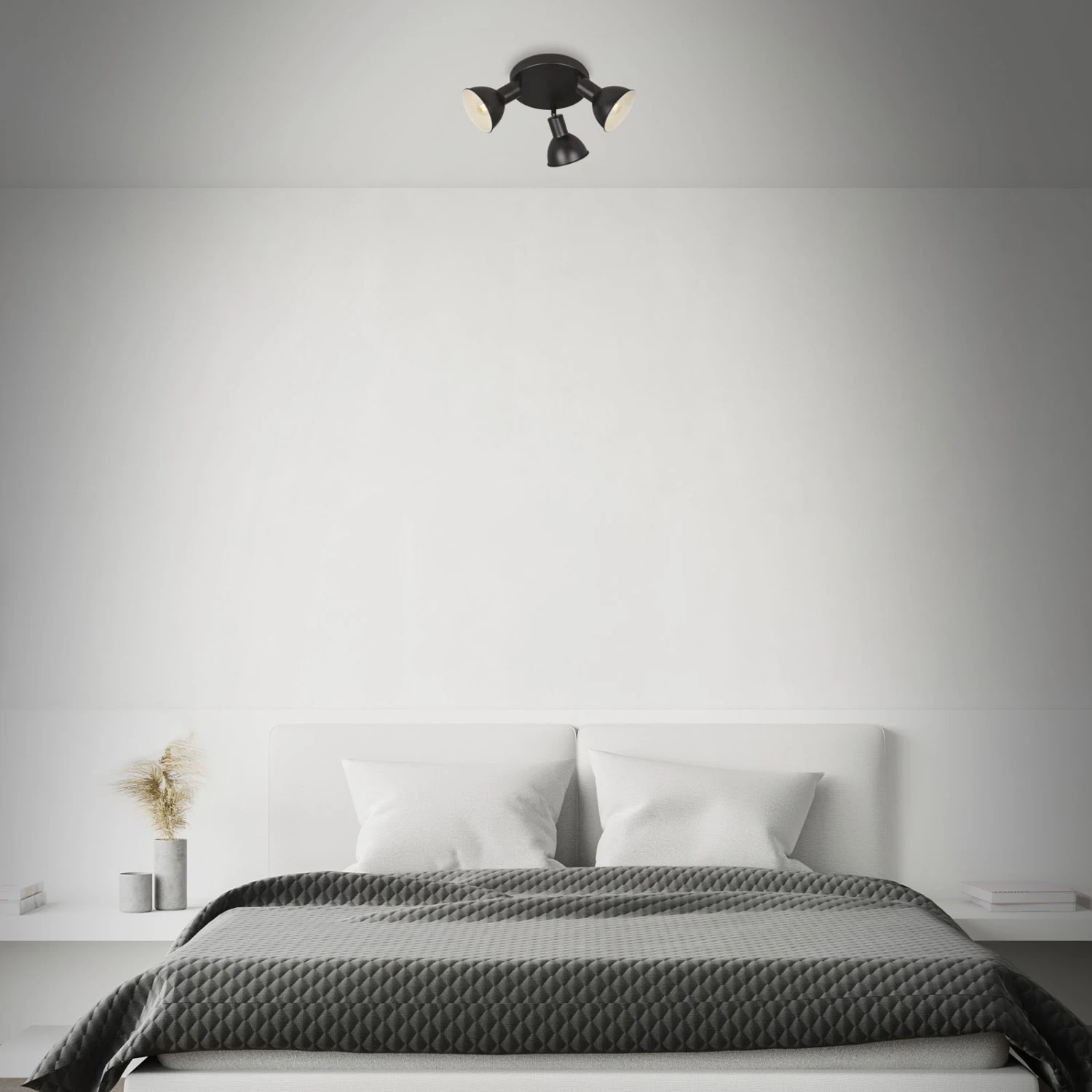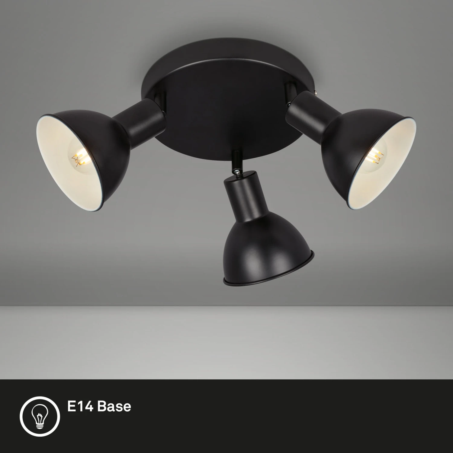 Für eine individuelle Beleuchtung sorgen die verstellbaren und schwenkbaren Lampenschirme der Deckenleuchte. Sie ist so vielseitig einsetzbar, dass sie als Wohnzimmerlampe, Flurlampe oder Schlafzimmerleuchte verwendet werden kann. Die runde Vintage Spotleuchte benötigt E14-Birnen mit einer maximalen Leistung von 25 Watt, die nicht im Lieferumfang enthalten sind. Diese vintage Deckenlampe zeichnet sich durch ihr Design aus. Die verstellbare Deckenbeleuchtung für zu Hause sticht optisch durch die schwarz-weiße Farbgestaltung hervor. Die 3 Lampenschirme des Deckenspots sind auf der Innenseite weiß und auf der Außenseite schwarz. Im Wohnzimmer, im Flur und im Schlafzimmer sieht der Spot fantastisch aus. Der Strahler hat ein kompaktes Design mit Produktabmessungen von 190 x 140 mm (DxH)