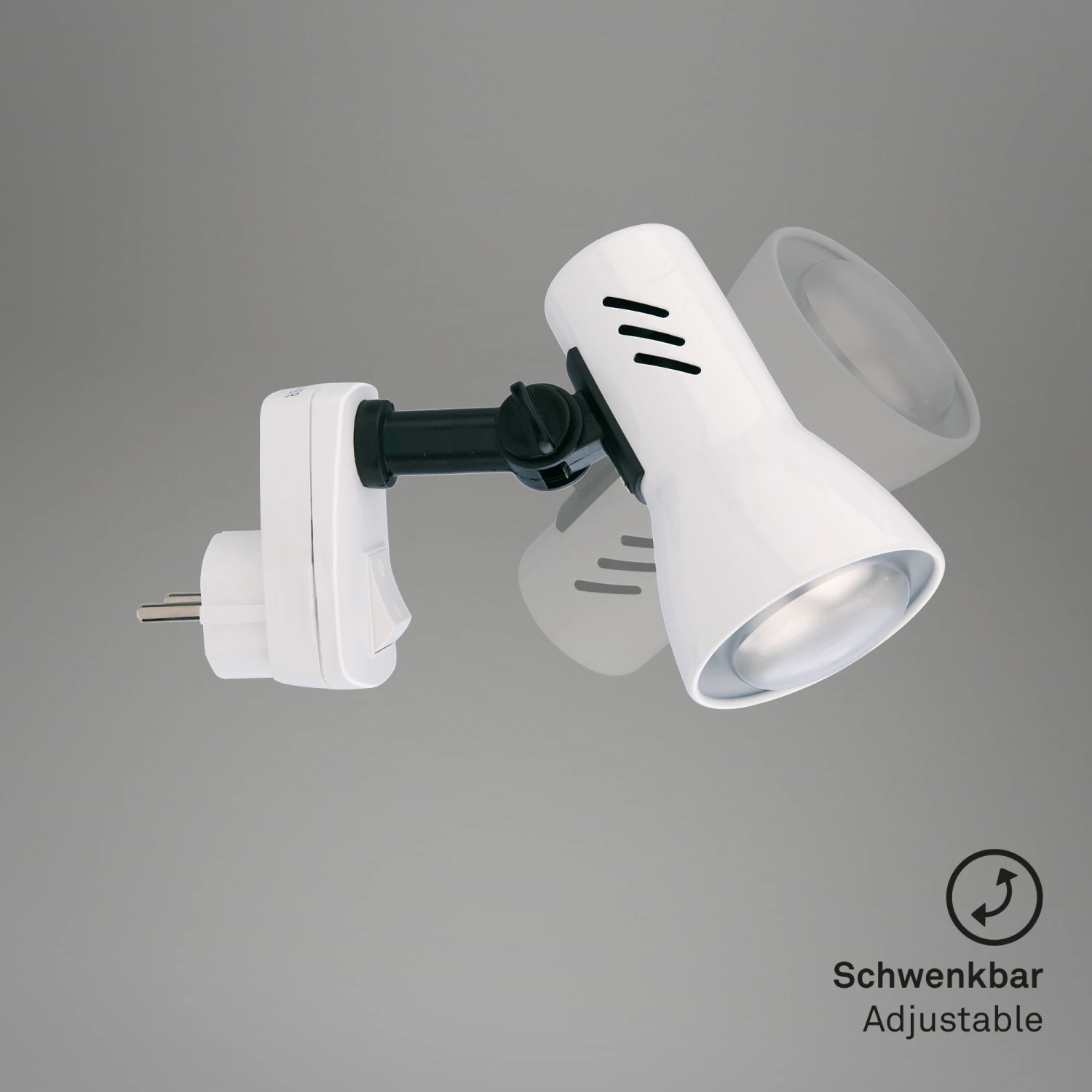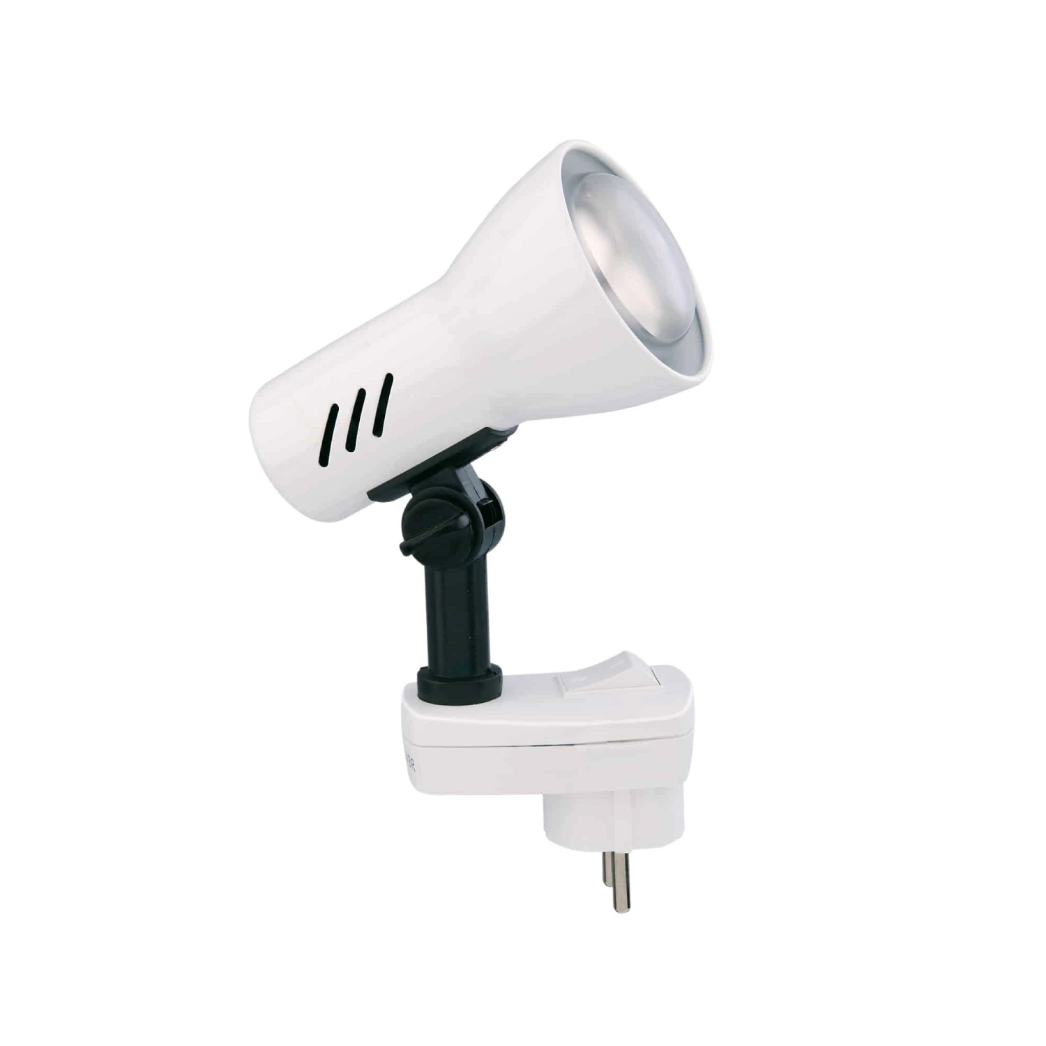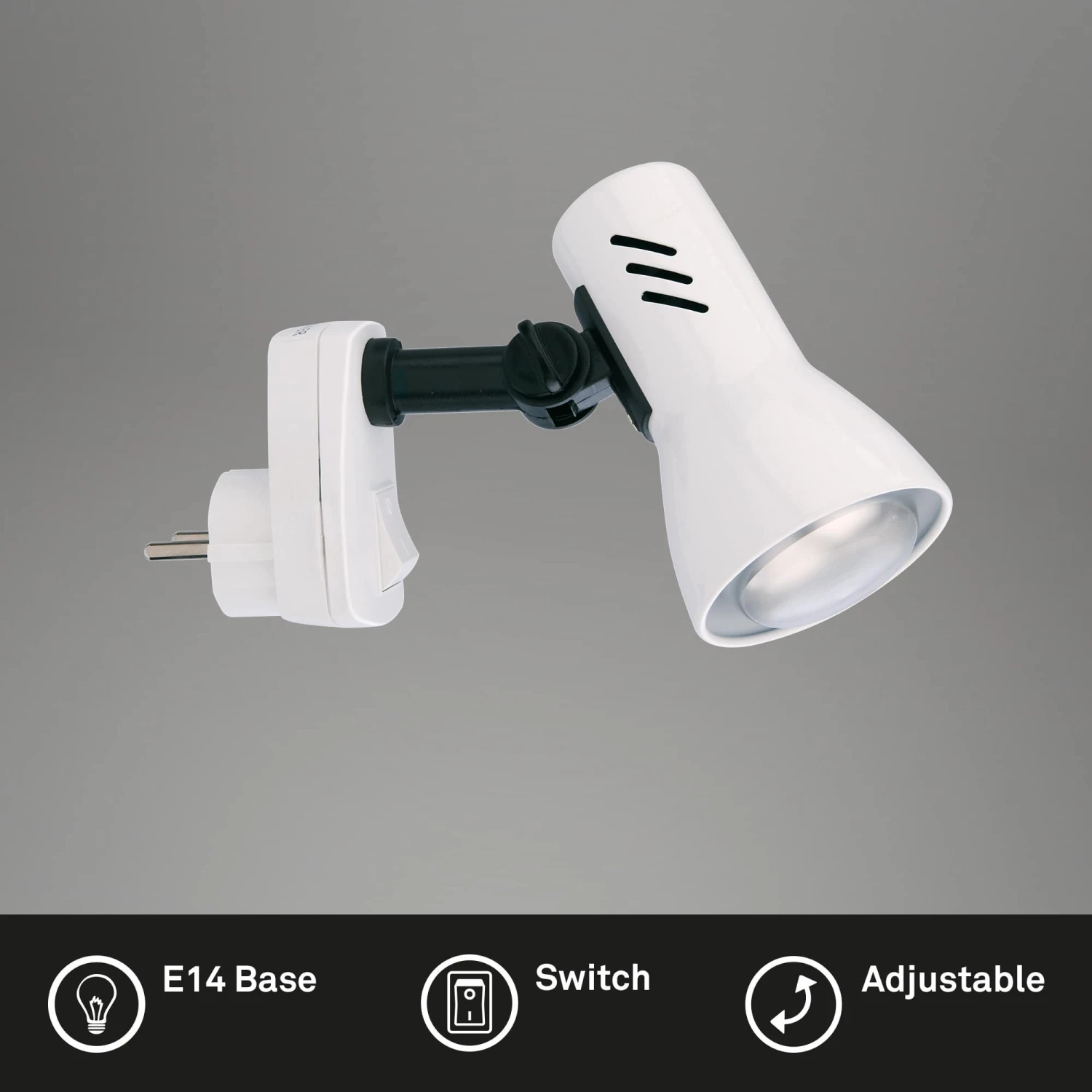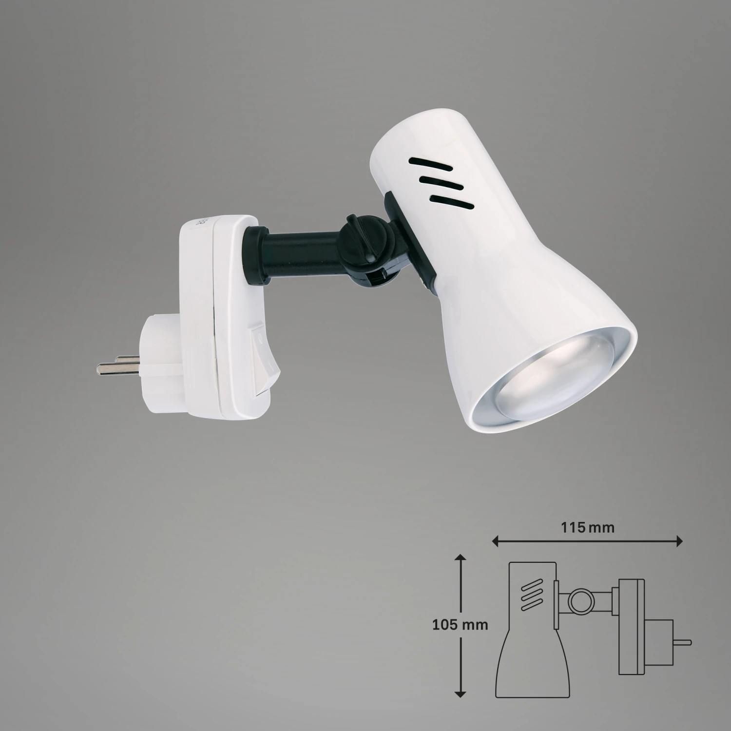 Steckerleuchte, 1-flammig „FICHE“ Metall-Kunststoff / weiß exkl. 1 x E14 25W max., ohne Leuchtmittel inkl. Wippschalter, Strahler dreh-und schwenkbar IP20 / Schutzklasse 1 115x105mm (AxH)