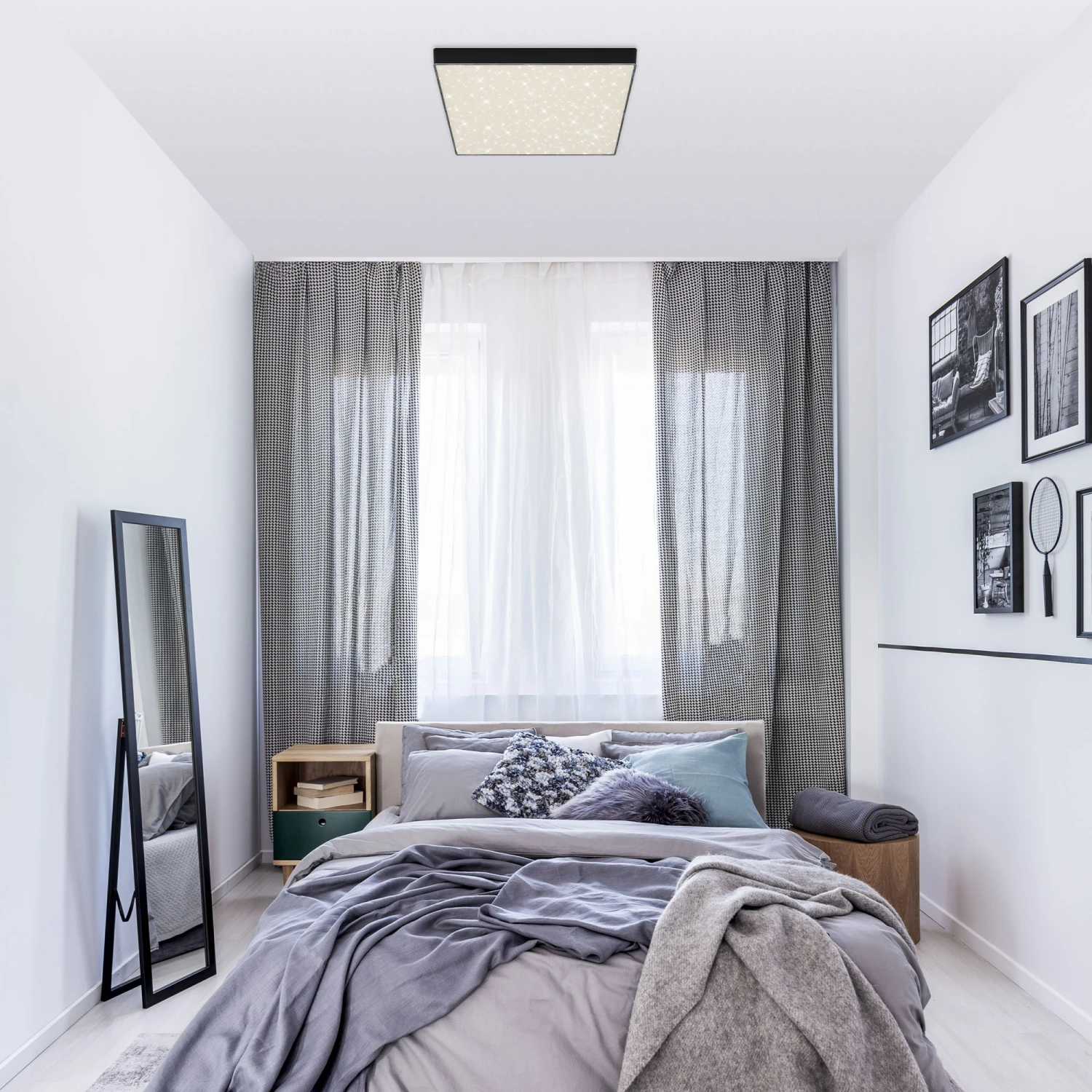 Durch das schlichte, rahmenlose Design wird diese Leuchte auch in Ihren Räumlichkeiten zu einem Hingucker und ist vielseitig einsetzbar. Ein besonderes Highlight dieser Deckenleuchte ist das Rahmenlose Design. Damit setzt die Aufbaulampe optische Akzente und setzt sich von herkömmlichen Deckenlampen designtechnisch ab. So ist LED Lampe vollflächig beleuchtet. Ein weiteres Highlight ist das Sternendekor, der für einen gemütlichen Lichteffekt sorgt und eine optimale Wohlfühlatmosphäre erschafft. So können Sie die Aufbauleuchte beispielsweise in Wohnzimmer, Schlafzimmer, Flur, Büro oder Kinderzimmer anbringen und für eine optimale Ausleuchtung sorgen. 4000 Kelvin erzeugen eine neutralweiße Farbtemperatur, welche mit 21 Watt und 2000 Lumen für Helligkeit sorgt. Die durchschnittliche Lebensdauer liegt bei ca. 25.000 Stunden. Die Schutzart der Leuchte ist IP20. Produktabmessungen: 287x287x36 mm (LxBxH)