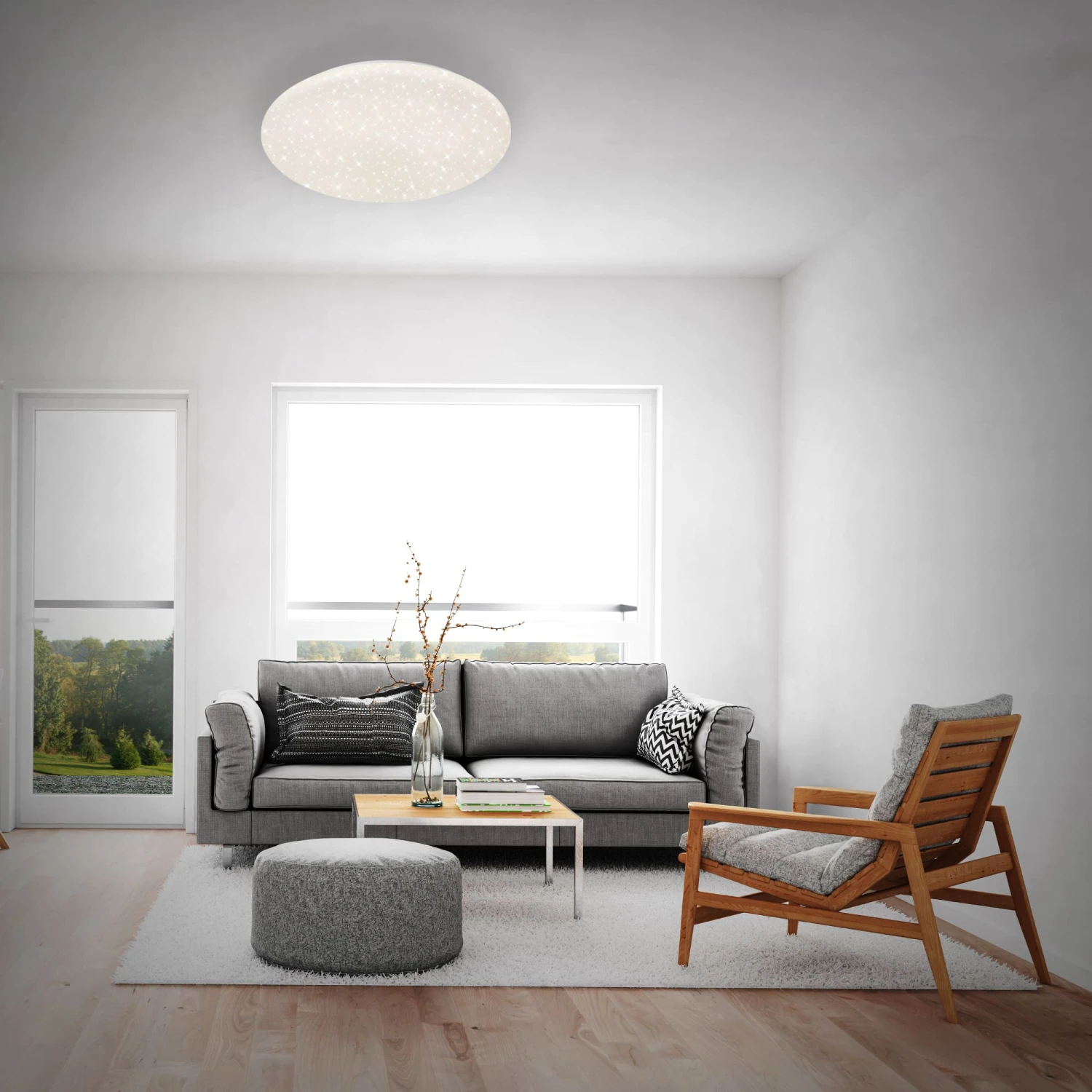 – Moderne LED Deckenleuchte mit Sternenhimmel (viele kleine Leuchtioden die zusätzlich zum Vorschein kommen, keine Projektion) in weiß, gefertigt aus Kunststoff-Metall