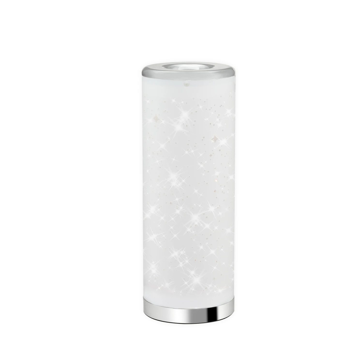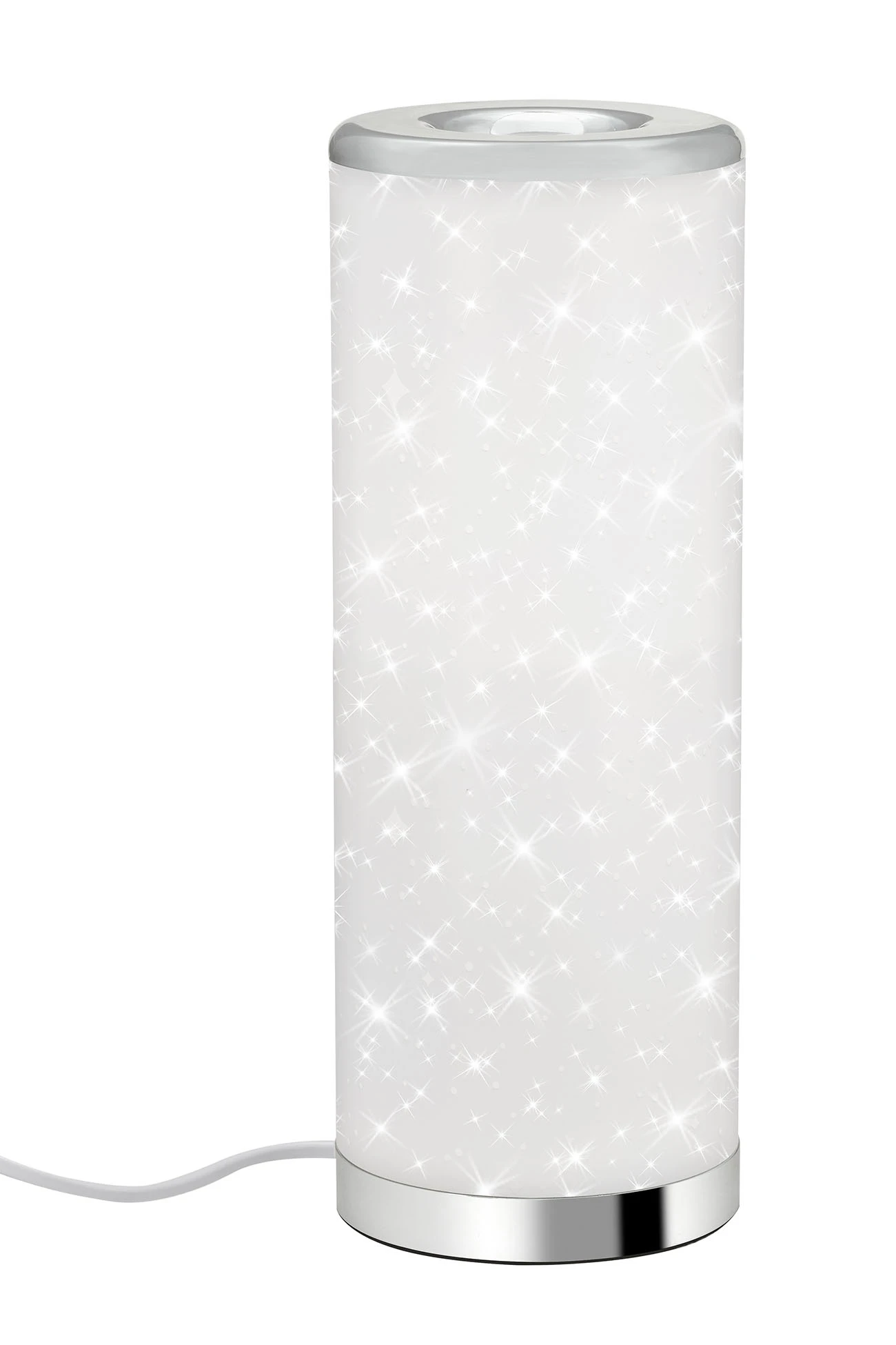 – Moderne LED Tischleuchte mit Sternendekor (viele kleine Leuchtioden die zusätzlich zum Vorschein kommen, keine Projektion) in weiß-chrom, gefertigt aus Kunststoff