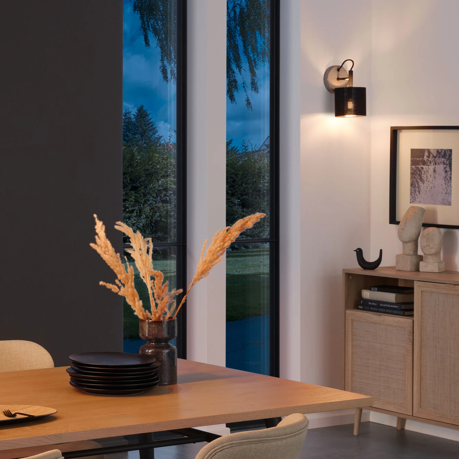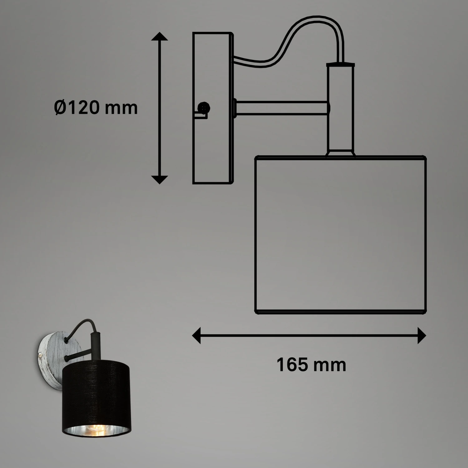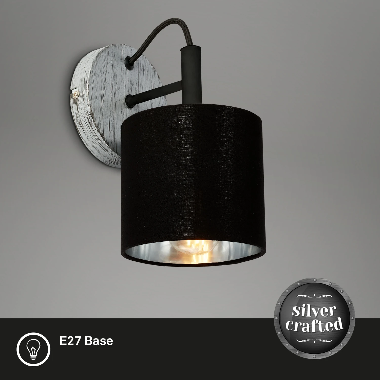 Die ansprechende Farbe in einem Antik-Silber (Silver Crafted) mit schwarzem Stoffschirm, ist das Markenzeichen dieses Wandstrahlers. Der Textilschirm dämpft die Ausleuchtung und sorgt für ein gemütliches Licht. Die E14-Fassung des Strahlers nimmt Glühbirnen mit bis zu 25 Watt auf. Für ein optisch stimmiges Gesamtbild empfiehlt sich ein Retro-Leuchtmittel. Der antik-silberne Wandspot hat die Maße 120×165 mm und eignet sich hervorragend als Dekoleuchte in Wohnzimmer und Flur sowie Leseleuchte oder Bettleuchte im Schlafzimmer. Ein Leuchtmittel ist nicht enthalten