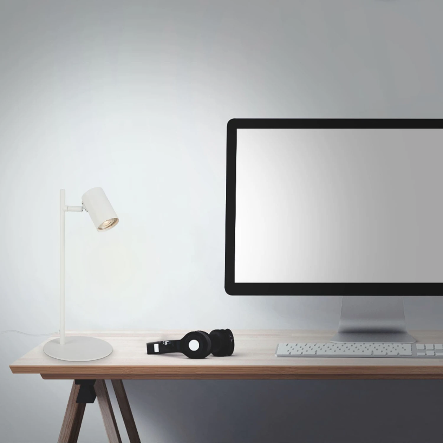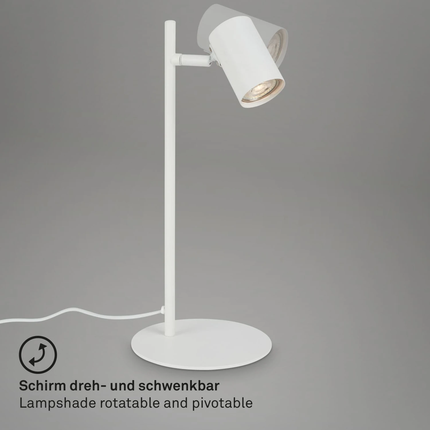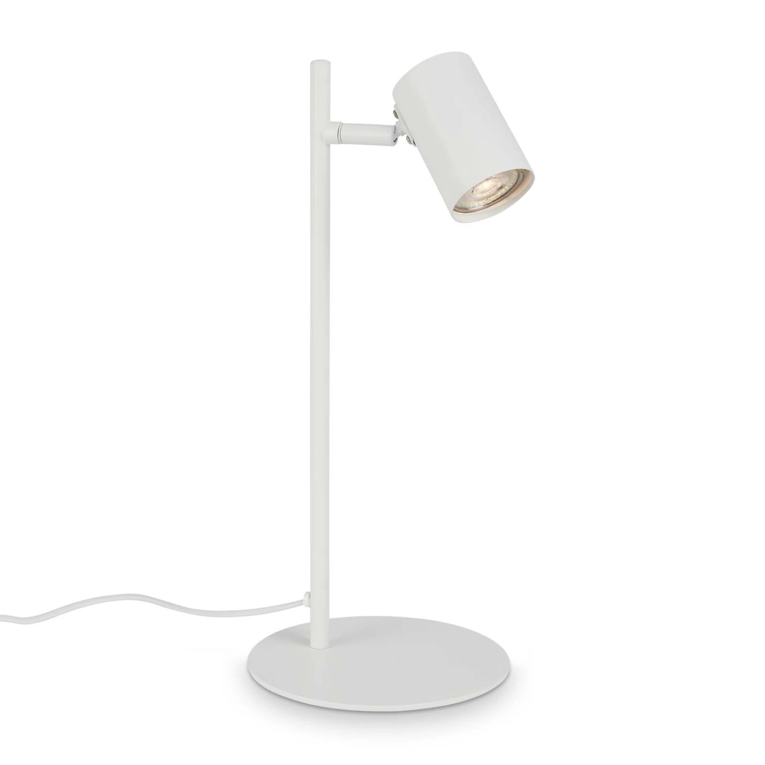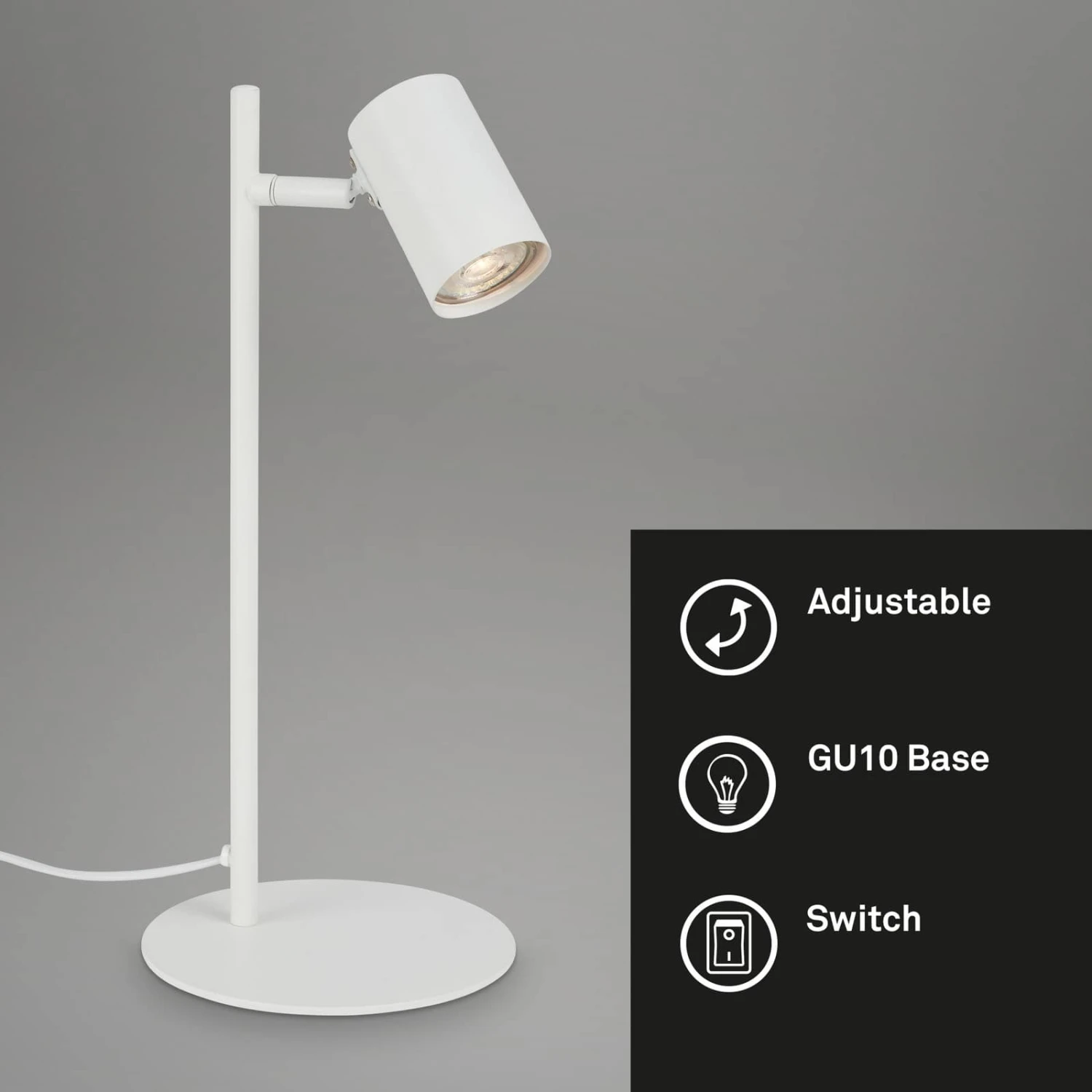 Diese weiße, schwenkbare Schreibtischlampe wird über ein Kabel mit Strom versorgt, das an eine Steckdose angeschlossen wird. Der Sockel ist flach und robust und sorgt für einen stabilen Stand. Der Spot der Leselampe ist schwenkbar und kann somit unabhängig positioniert werden. Damit ist sie ideal für den Einsatz am Schreibtisch, am Arbeitsplatz oder zum Lesen im Schlafzimmer. Ein Kippschalter am Steckerkabel ermöglicht ein einfaches Ein