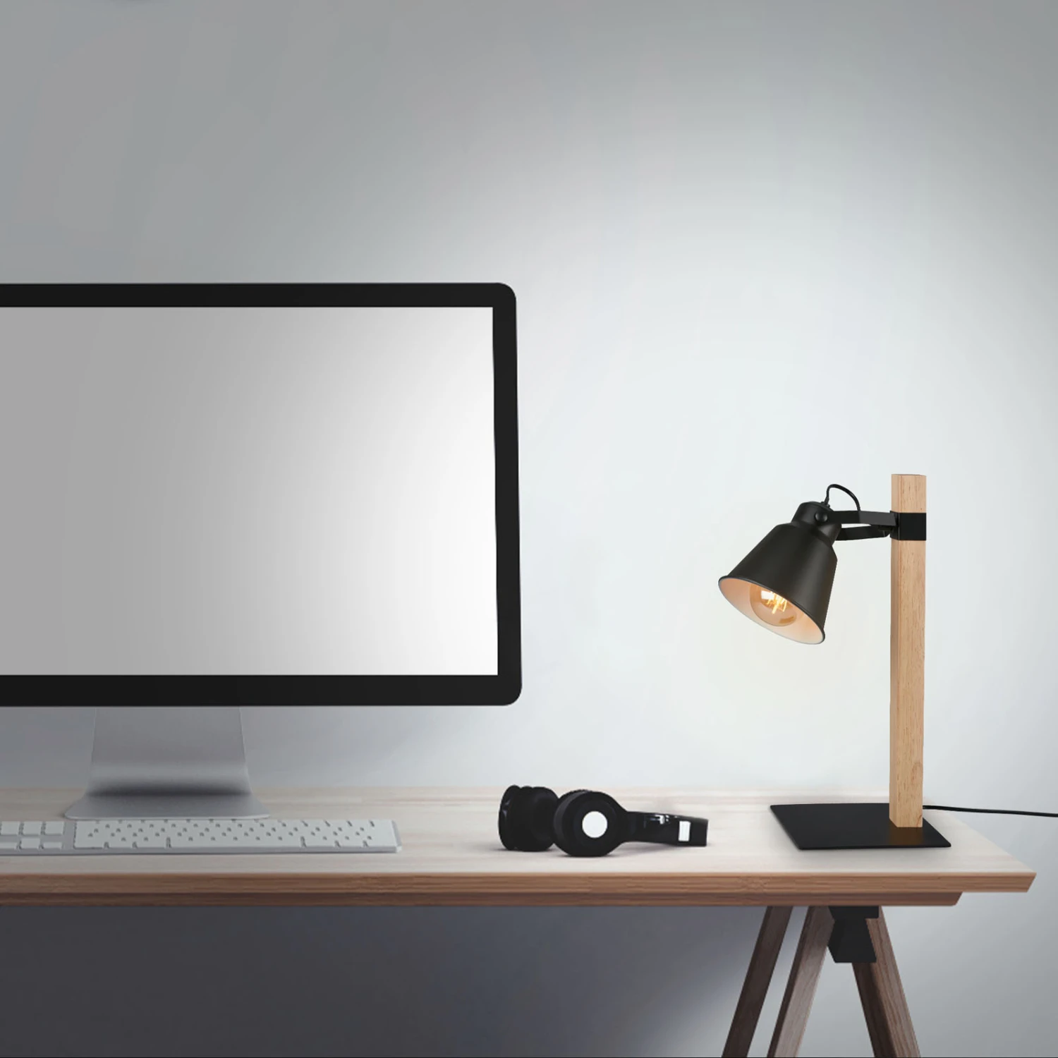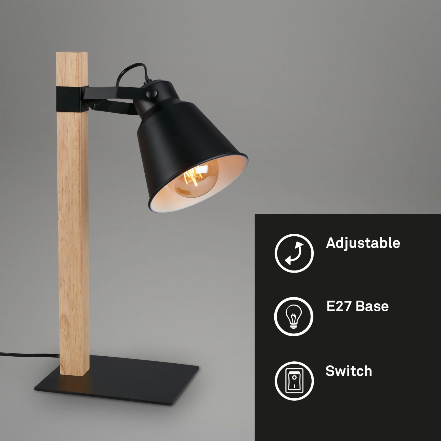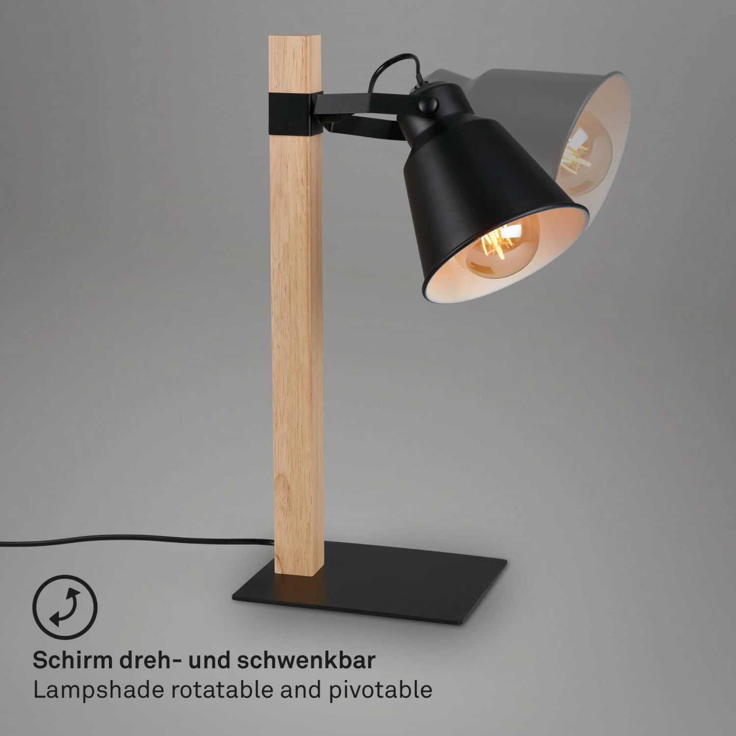 Diese schwarze vintage Tischleuchte bringt ein gemütliches Ambiente in Ihren Wohnbereich und setzt einen stilvollen Akzent. Der Holzständer auf dem sehr flachen Standfuß ist das besondere Highlight der Lampe. Durch das verbaute Gelenk am Lampenkopf, lässt sich die Leuchte individuell schwenken und drehen. Die 1-flammige Bürotischlampe verfügt über eine E27 Fassung. Die maximale Wattage für die Lampe beträgt 25 Watt. Lichtfarbe und Helligkeit können Sie hierbei selbst bestimmen
