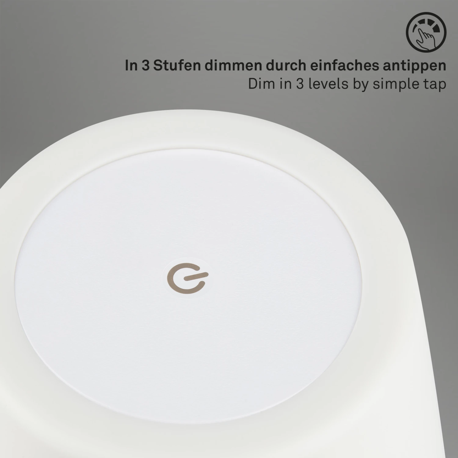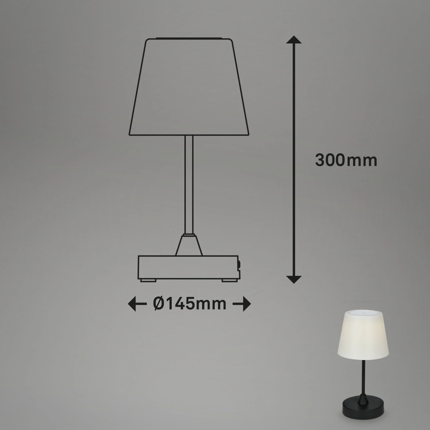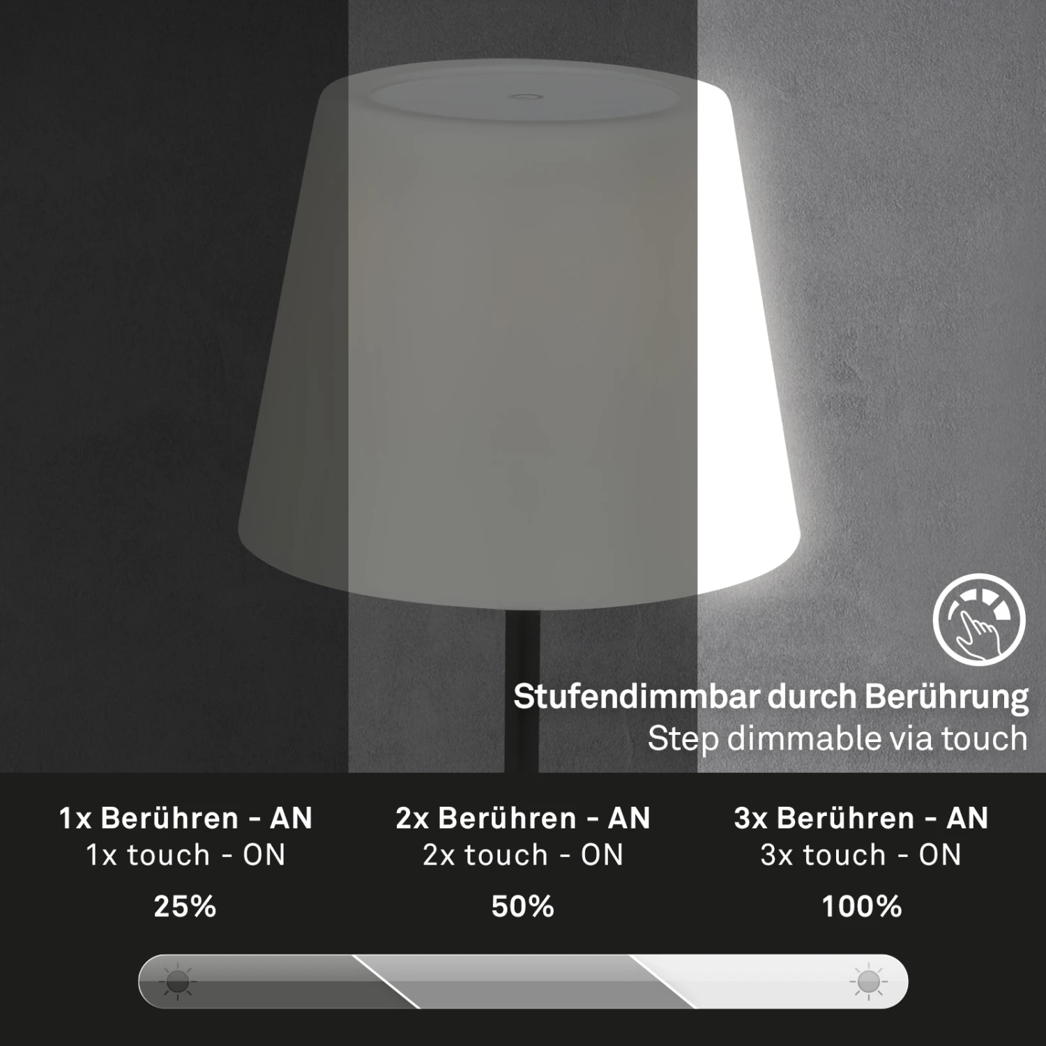 – Stufige dimmen der Helligkeit ermöglichen, sowie der verbaute Akku. Der eingebaute Akku hat im voll aufgeladenem Zustand eine Laufzeit von bis zu 9 Stunden. Mithilfe des mitgelieferten USB Kabels ist das Dekolicht wiederaufladbar. Durch die Portabilität, sind die Einsatzbereiche der Akkulampe unbegrenzt. Ob Gartentisch, Esstisch, Balkon, Fensterbank, Sideboard, Schrank oder Kochinsel. Mit der Schutzart IP44, die einen Spritzwasserschutz bietet, ist die Dekoleuchte flexibel platzierbar. Die Produktmaße der schwarzen Funktionlampe mit weißem, pflegeleichten Kunststoff-Schirm sind 300x145mm (HxD), 125mm (D) Sockel