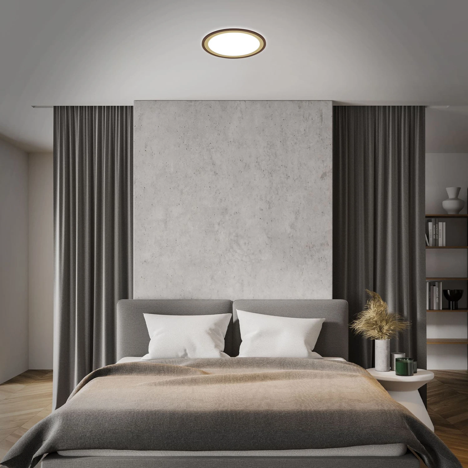Die unglaublich niedrige Höhe von 2,9 cm und der ansprechende Hinterleuchtungseffekt, der ein schönes, indirektes Licht an der Wohnzimmerdecke erzeugt, sind die Markenzeichen dieser LED-Büroleuchte. Diese moderne LED-Lampe hat einen braunen, dünnen Rand und einem Goldton (Silver Crafted) als Zierde auf der Innenseite. Die Leuchte ist mit 3000 Lumen sehr hell und eignet sich perfekt für Flur, Küche und Büro. Die Farbtemperatur kann über die CCT-Funktion separat eingestellt werden. Warmweißes, neutralweißes und kaltweißes Licht (2700-6500 K) stehen für den Einsatz im Wohn-, Schlaf
